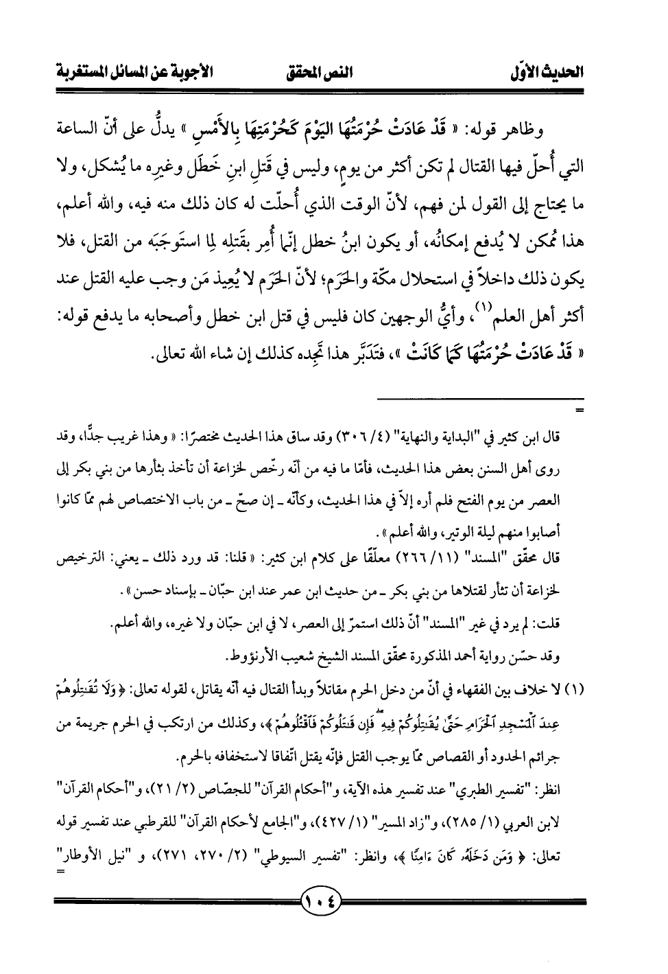 وظاهر قوله: "قَدْ عَادَتْ حُرْمَتُهَا اليَوْمَ كحُرْمَتِهَا بِالأَمْسِ" يدلُّ على أنّ الساعة التي أُحلّ فيها القتال لم تكن أكثر من يومٍ، وليس في قَتلِ ابنِ خَطَل وغيرِه ما يُشكل، ولا ما يحتاج إلى القول لمن فهم؛ لأنّ الوقت الذي أُحلّت له كان ذلك منه فيه، والله أعلم، هذا مُمكن لا يُدفع إمكانُه، أو يكون ابنُ خطل إنّما أُمِر بقَتلِه لمِا استَوجَبَه من القتل، فلا يكون ذلك داخلًا في استحلال مكّة والحرَم؛ لأنّ الحَرَم لا يُعِيذ مَن وجب عليه القتل عند أكثر أهل العلم (¬1)، وأيُّ الوجهين كان فليس في قتل ابن خطل وأصحابه ما يدفع قوله: "قَدْ عَادَتْ حُرْمَتُهَا كَما كَانَتْ"، فتَدَبَّر هذا تَجِده كذلك إن شاء الله تعالى.