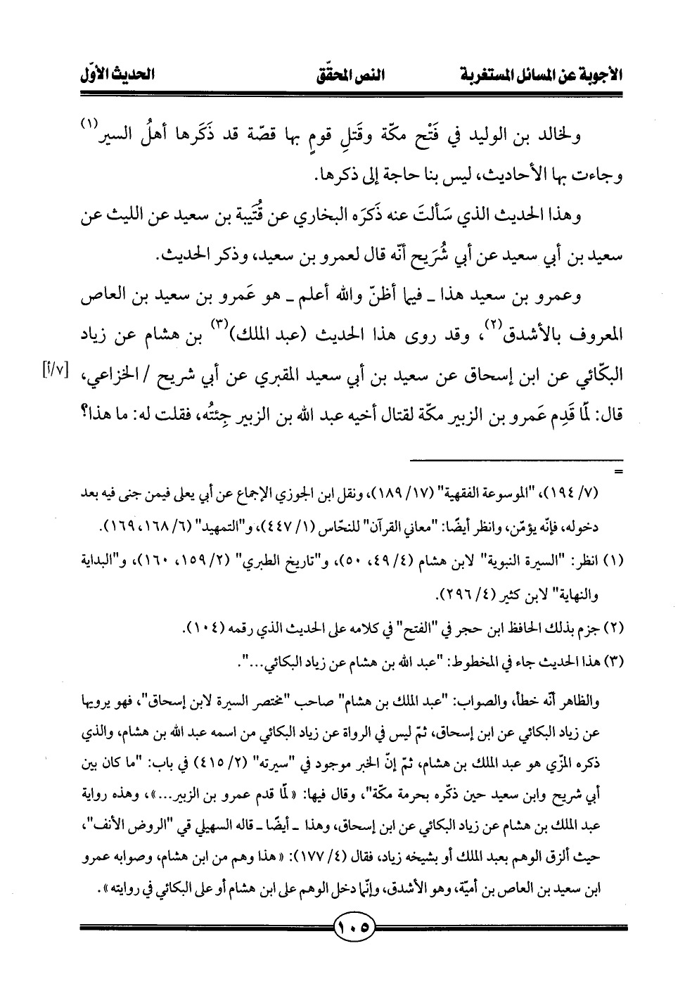 والظاهر أنّه خطأ، والصواب: "عبد الملك بن هشام" صاحب "مختصر السيرة لابن إسحاق"، فهو يرويها عن زياد البكائي عن ابن إسحاق، ثمّ ليس في الرواة عن زياد البكائي من اسمه عبد الله بن هشام، والذي ذكره المّزي هو عبد الملك بن هشام، ثمّ إنّ الخبر موجود في "سيرته" (2/ 415) في باب: "ما كان بين أبي شريح وابن سعيد حين ذكّره بحرمة مكّة"، وقال فيها: "لمّا قدم عمرو بن الزبير ... "، وهذه رواية عبد الملك بن هشام عن زياد البكائي عن ابن إسحاق، وهذا - أيضًا - قاله السهيلي في "الروض الأنف"، حيث ألزق الوهم بعبد الملك أو بشيخه زياد، فقال (4/ 177): "هذا وهم من ابن هشام، وصوابه عمرو ابن سعيد بن العاص بن أميّة، وهو الأشدق، وإنّما دخل الوهم على ابن هشام أو على البكائي في روايته".
