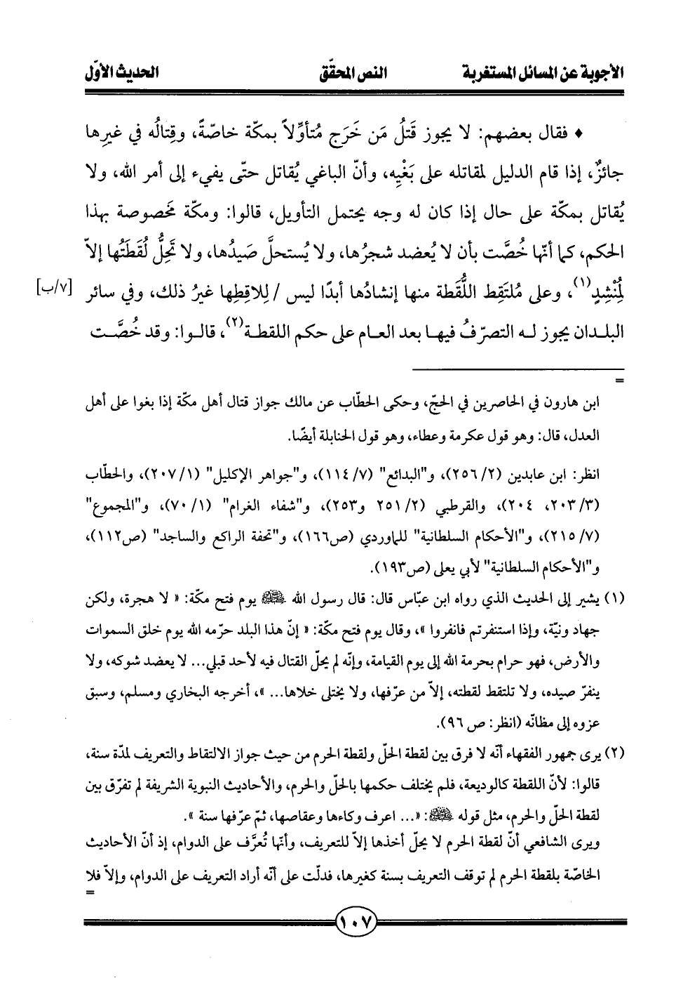 * فقال بعضهم: لا يجوز قَتلُ مَن خَرَج مُتأوِّلًا بمكّة خاصّةً، وقِتالُه في غيرِها جائزٌ، إذا قام الدليل لمقاتله على بَغْيِه، وأنّ الباغي يُقاتل حتّي يفيء إلى أمر الله، ولا يُقاتل بمكّة على حال إذا كان له وجه يحتمل التأويل، قالوا: ومكّة مَخصوصة بهذا الحكم، كما أنّها خُصَّت بأن لا يُعضد شجرُها، ولا يُستحلَّ صَيدُها، ولا تَحِلُّ لُقَطَتُها إلّا لِمُنْشِدٍ (¬1)، وعلى مُلتَقِط اللُّقَطة منها إنشادُها أبدًا ليس لِلاقِطِها غيرُ ذلك، وفي سائر البلدان يجوز له التصرّفُ فيها بعد العام على حكم اللقطة (¬2)، قالوا: وقد خُصَّت