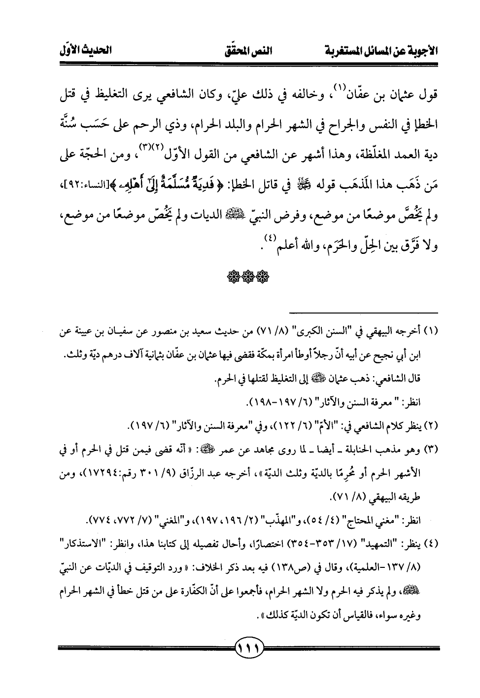 (¬4) ينظر: "التمهيد" (17/ 353 - 354) اختصارًا، وأحال تفصيله إلى كتابنا هذا، وانظر: "الاستذكار" (8/ 137 - العلمية)، وقال في (ص 138) فيه بعد ذكر الخلاف: "ورد التوقيف في الديّات عن النبيّ - صلى الله عليه وسلم -، ولم يذكر فيه الحرم ولا الشهر الحرام، فأجمعوا على أنّ الكفّارة على من قتل خطأ في الشهر الحرام وغيره سواء، فالقياس أن تكون الديّة كذلك".