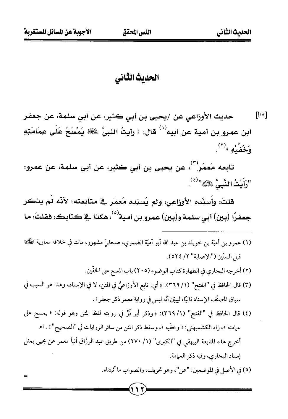 حديث الأوزاعي عن يحيى بن أبي كثير، عن أبي سلمة، عن جعفر ابن عمرو بن أمية عن أبيه (¬1) قال: "رأيتُ النبيَّ - صلى الله عليه وسلم - يَمْسَحُ عَلَي عِمَامَتِهِ وَخُفَّيْهِ" (¬2).