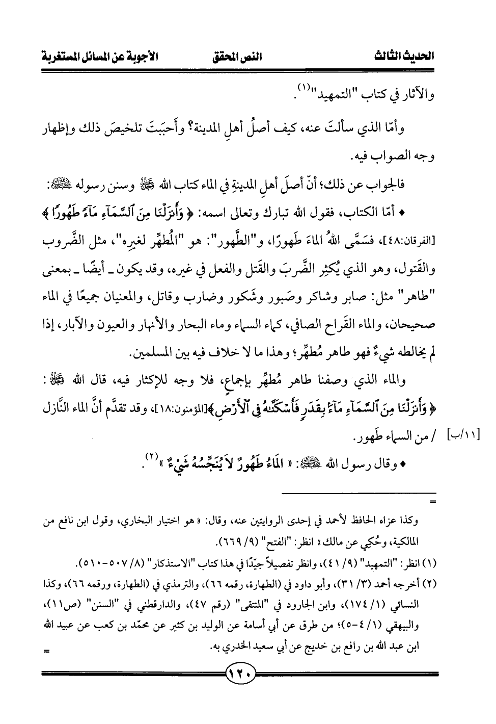 فالجواب عن ذلك؛ أنّ أصلَ أهلِ المدينةِ في الماء كتاب الله عز وجل وسنن رسوله - صلى الله عليه وسلم -:
