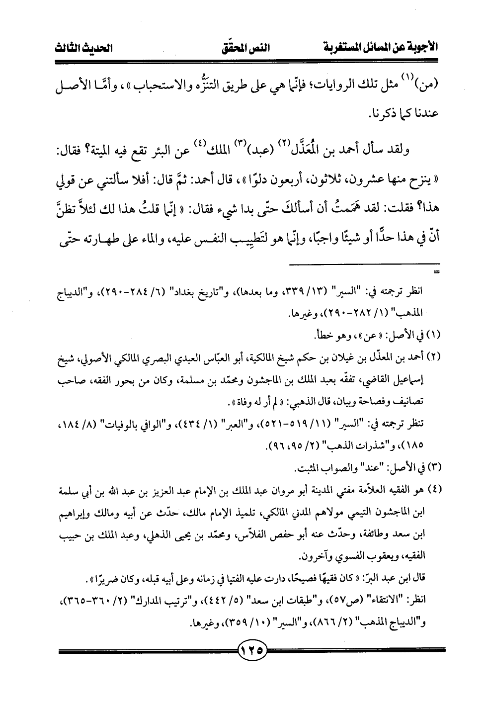 ولقد سأل أحمد بن المُعَذَّل (¬2) (عبد) (¬3) الملك (¬4) عن البئر تقع فيه الميتة؟ فقال: "ينزح منها عشرون، ثلاثون، أربعون دلوًا"، قال أحمد: ثمَّ قال: أفلا سألتني عن قولي هذا؟ فقلت: لقد هَمَمتُ أن أسألكَ حتّى بدا شيء فقال: "إنّما قلتُ هذا لك لئلاَّ تظنَّ أنّ في هذا حدًّا أو شيئًا واجبًا، وإنّما هو لتَطيِيب النفس عليه، والماء على طهارته حتّى