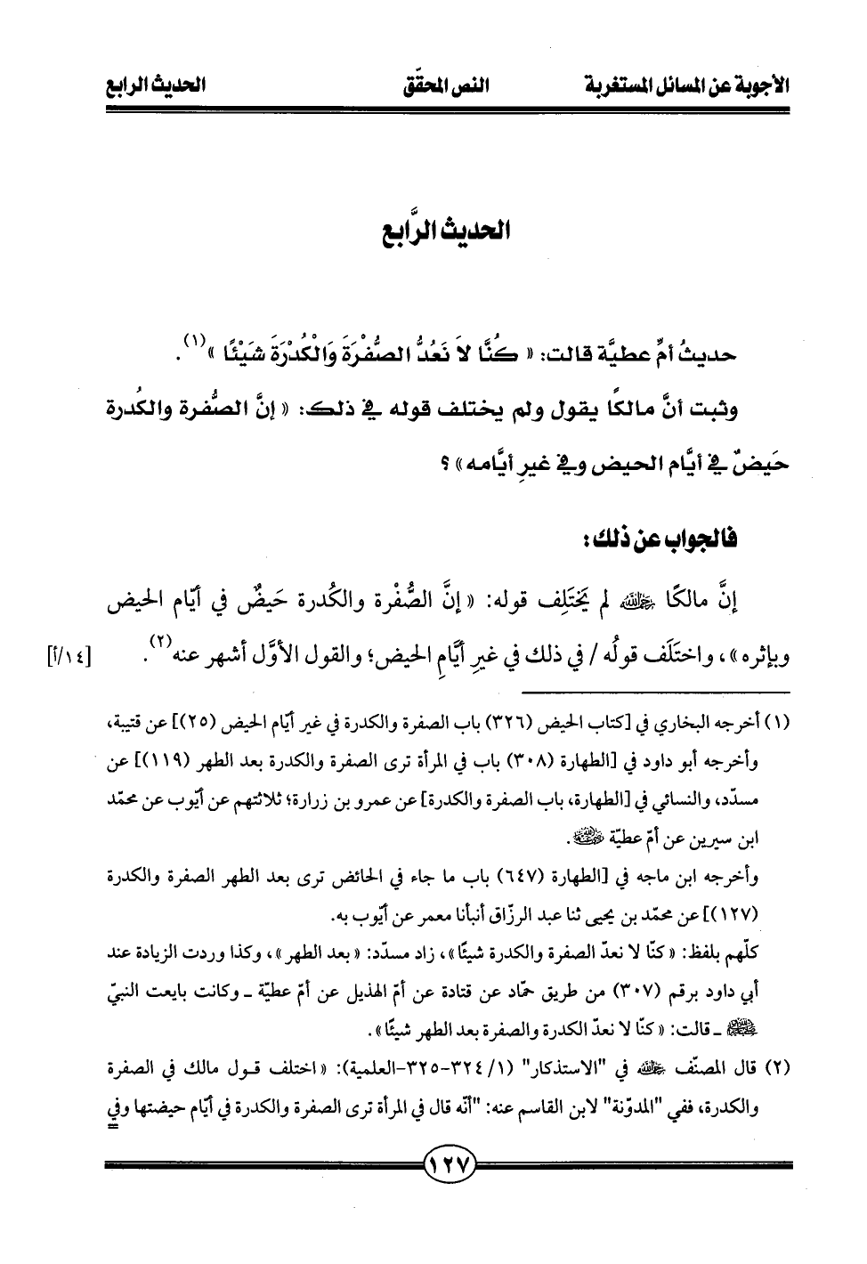 إنَّ مالكًا - رحمه الله - لم يَختَلِف قوله: "إنَّ الصُّفْرة والكُدرة حَيضٌ في أيّام الحيض وبإثره"، واختَلَف قولُه في ذلك في غيرِ أيَّامِ الحيض؛ والقول الأوَّل أشهر عنه (¬2).