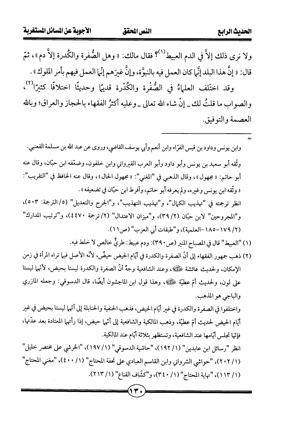 ولا نرى ذلك إلاَّ في الدم العبيط (¬1)؟ فقال مالك: "وهل الصُّفرة والكُدرة إلاَّ دم"، ثمّ قال: "إنَّ هذا البلد إنَّما كان العمل فيه بالنبوَّة، وإنَّ غيرَهم إنّما العمل فيهم بأمر الملوك".