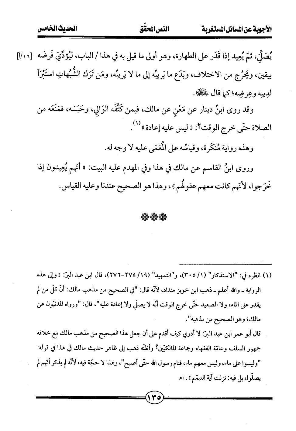 قال أبو عمر ابن عبد البرّ: لا أدري كيف أقدم على أن جعل هذا الصحيح من مذهب مالك مع خلافه جمهور السلف وعامّة الفقهاء وجماعة المالكيّين؟ وأظنّه ذهب إلى ظاهر حديث مالك في هذا في قوله: "وليسوا على ماء، وليس معهم ماء، فنام رسول الله حتّى أصبح"، وهذا لا حجّة فيه؛ لأنّه لم يذكر أنّهم لم يصلّوا، بل فيه: نزلت آية التيمّم". اهـ