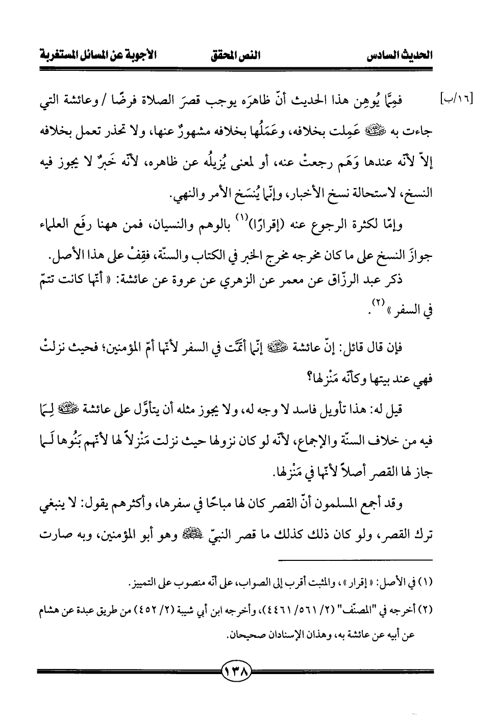 فإن قال قائل: إنّ عائشة - رضي الله عنها - إنّما أتَمَّت في السفر لأنّها أمِّ المؤمنين؛ فحيث نزلتْ فهي عند بيتها وكأنّه مَنْزلها؟