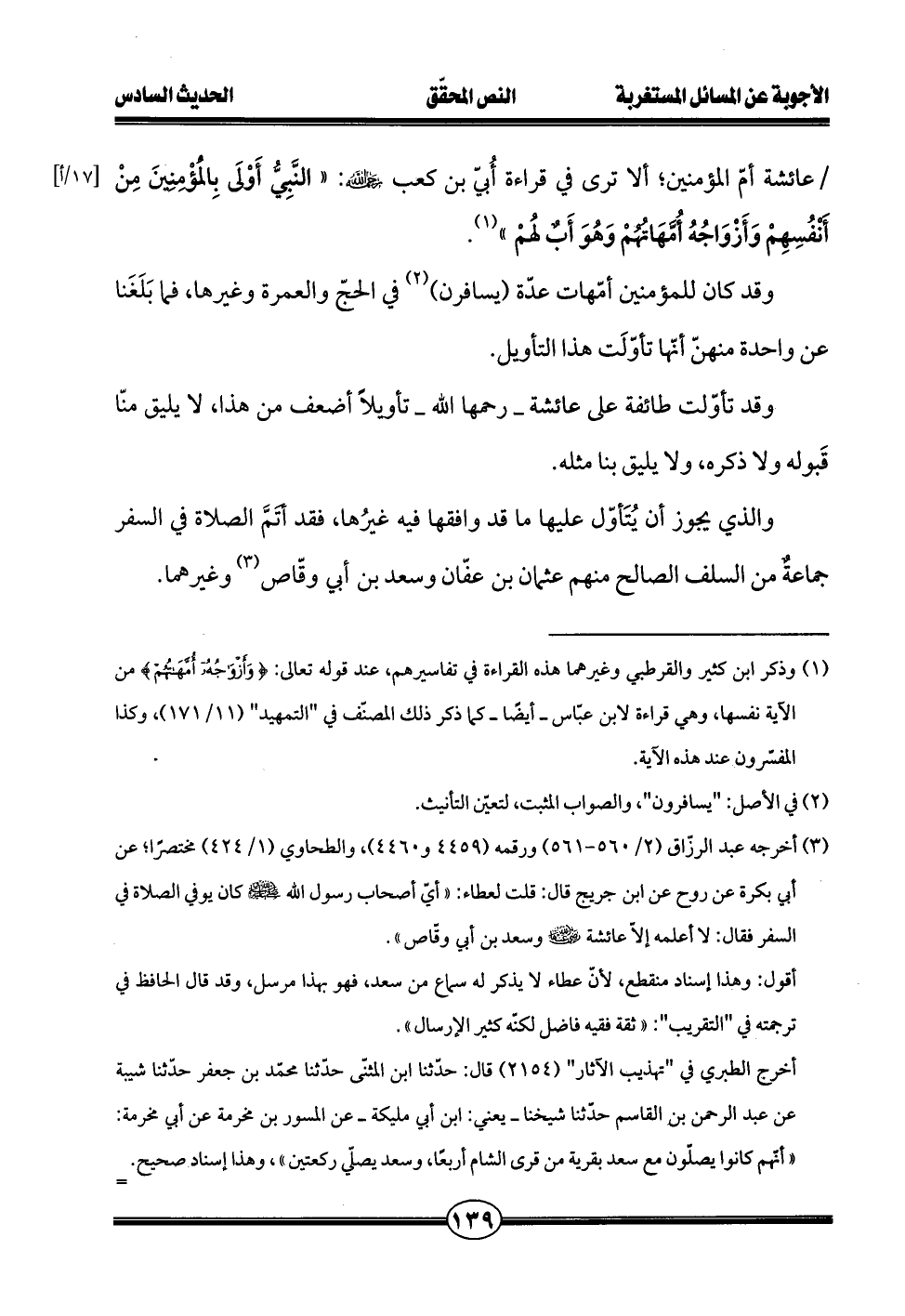 وقد كان للمؤمنين أمّهات عدّة (يسافرن) (¬2) في الحجّ والعمرة وغيرها، فما بَلَغَنا عن واحدة منهنّ أنّها تأوّلَت هذا التأويل.