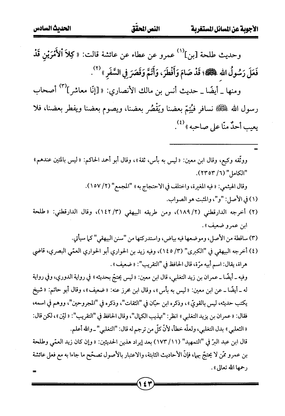 ومنها - أيضًا - حديث أنس بن مالك الأنصاري: " [إنّا معاشر] (¬3) أصحاب رسول الله - صلى الله عليه وسلم - نسافر فيُتِمّ بعضنا ويَقْصُر بعضنا، ويصوم بعضنا ويفطر بعضنا، فلا يعيب أحدٌ منّا على صاحبه" (¬4).