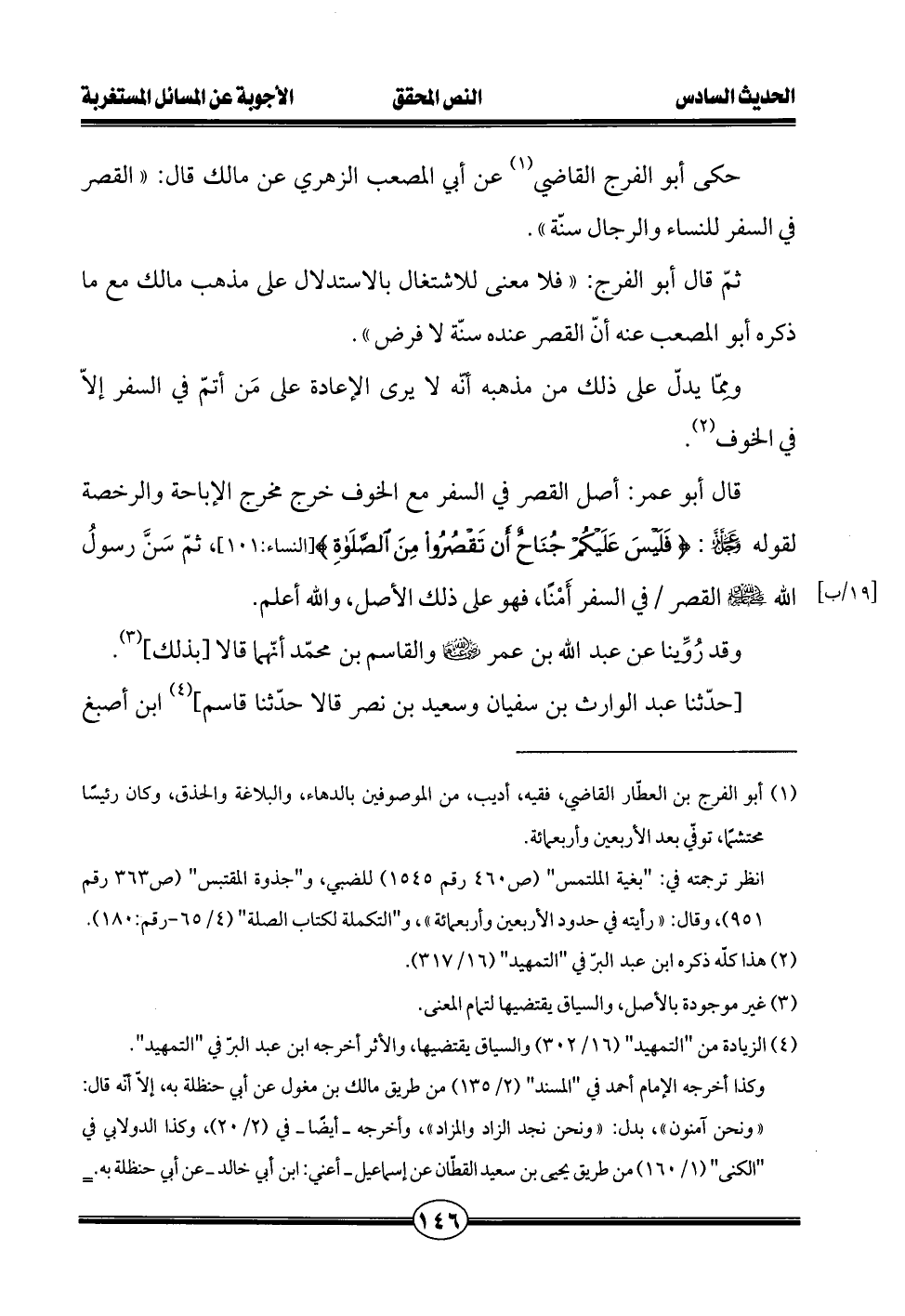 ثمّ قال أبو الفرج: "فلا معنى للاشتغال بالاستدلال على مذهب مالك مع ما ذكره أبو المصعب عنه أنّ القصر عنده سنّة لا فرض".