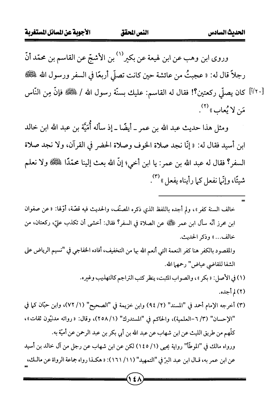 ومثل هذا حديث عبد الله بن عمر - أيضًا - إذ سأله أُمَيَّة بن عبد الله ابن خالد ابن أسيد فقال له: "إنّا نجد صلاة الخوف وصلاة الحضر في القرآن، ولا نجد صلاة السفر؟ فقال له عبد الله بن عمر: يا ابن أخي؛ إنّ الله بعث إلينا محمّدًا - صلى الله عليه وسلم - ولا نعلم شيئًا، وإنّما نفعل كما رأيناه يفعل" (¬3).