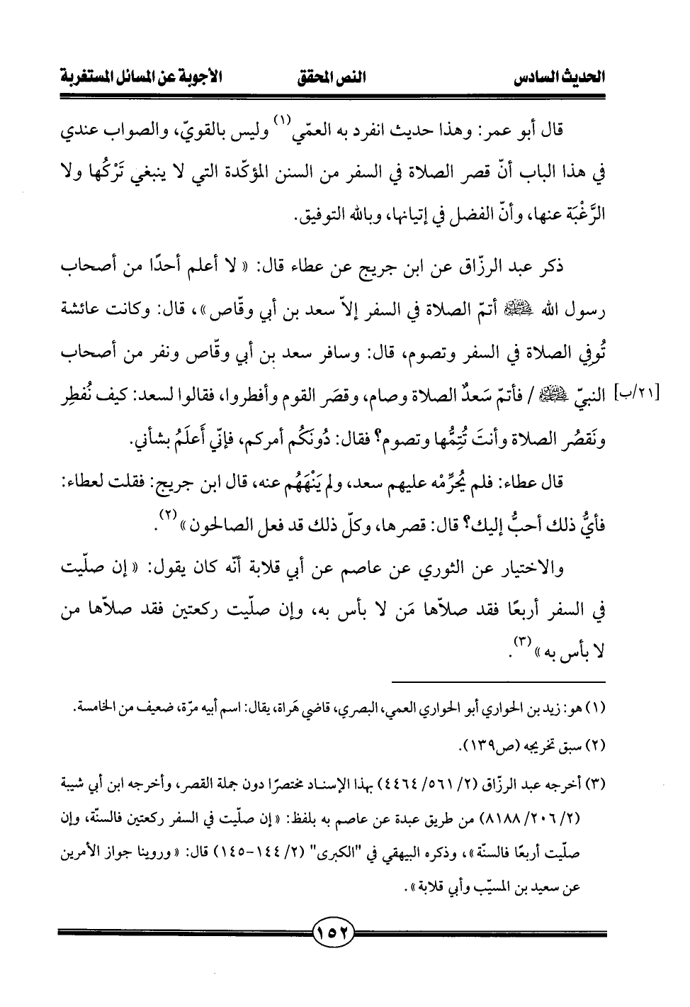 قال عطاء: فلم يُحرِّمْه عليهم سعد، ولم يَنْهَهُم عنه، قال ابن جريج: فقلت لعطاء: فأيُّ ذلك أحبُّ إليك؟ قال: قصرها، وكلّ ذلك قد فعل الصالحون" (¬2).
