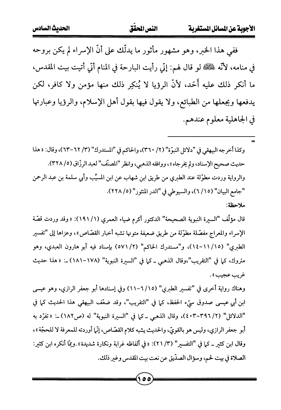 ففي هذا الخبر، وهو مشهور مأثور ما يدلّك على أنّ الإسراء لم يكن بروحه في منامه، لأنّه - صلى الله عليه وسلم - لو قال لهم: إنّي رأيت البارحة في المنام أنّي أتيت بيت المقدس، ما أنكر ذلك عليه أَحَد؛ لأنّ الرؤيا لا يُنكِر ذلك منها مؤمن ولا كافر، لكن يدفعها ويجعلها من الطبائع، ولا يقول فيها بقول أهل الإسلام، والرؤيا وعبارتها في الجاهلية معلوم عندهم.