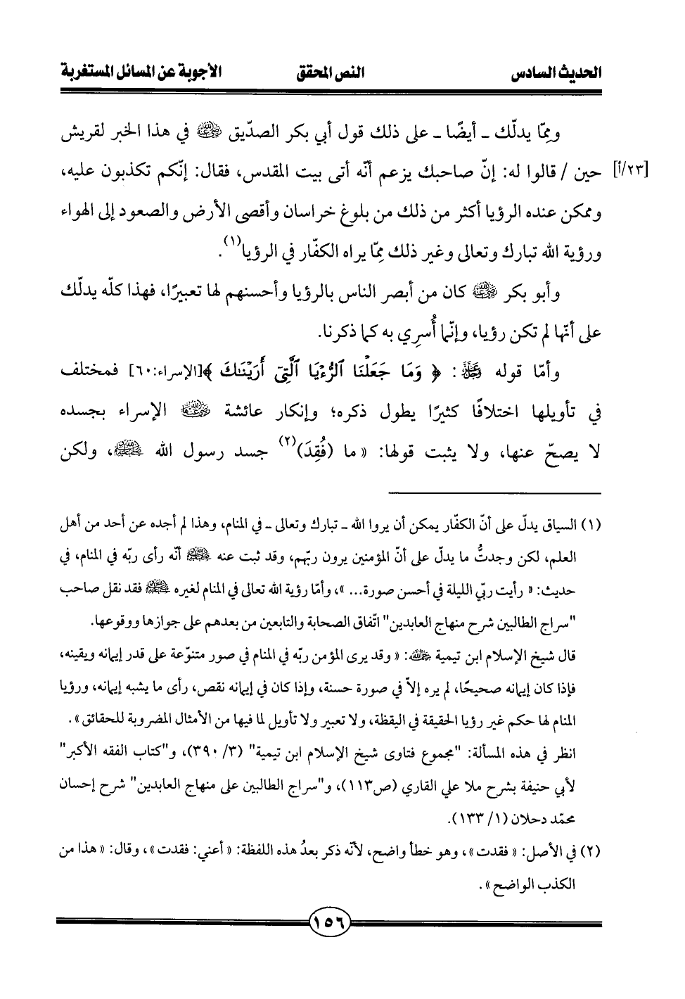 ومِمّا يدلّك - أيضًا - على ذلك قول أبي بكر الصدّيق - رضي الله عنه - في هذا الخبر لقريش حين قالوا له: إنّ صاحبك يزعم أنّه أتى بيت المقدس، فقال: إنّكم تكذبون عليه، وممكن عنده الرؤيا أكثر من ذلك من بلوغ خراسان وأقصى الأرض والصعود إلى الهواء ورؤية الله تبارك وتعالى وغير ذلك مِمّا يراه الكفّار في الرؤيا (¬1).