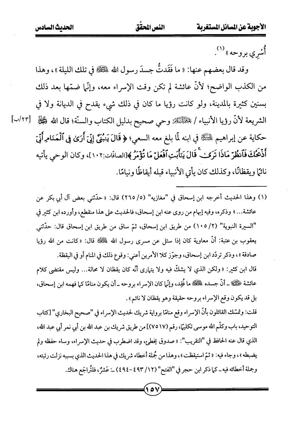 قلت: وتمسّك القائلون بأنّ الإسراء وقع منامًا برواية شريك لحديث الإسراء في "صحيح البخاري" [كتاب التوحيد، باب وكلّم الله موسى تكليمًا، رقم (7517)] من طريق شريك بن عبد الله بن أبي نمر أبي عبد الله، الذي قال عنه الحافظ في "التقريب": "صدوق يخطئ، وقد اضطرب في حديث الإسراء، وساء حفظه ولم يضبطه"، وجاء فيه: "ثمّ استيقظت"، وهذا من جُملة أخطاء شريك في هذا الحديث الذي بسببه نزلت رتبته، وجملة أخطائه فيه - كما ذكر ابن حجر في "الفتح" (12/ 493 - 494) -: عَشرٌ، فلتُراجَع هناك.