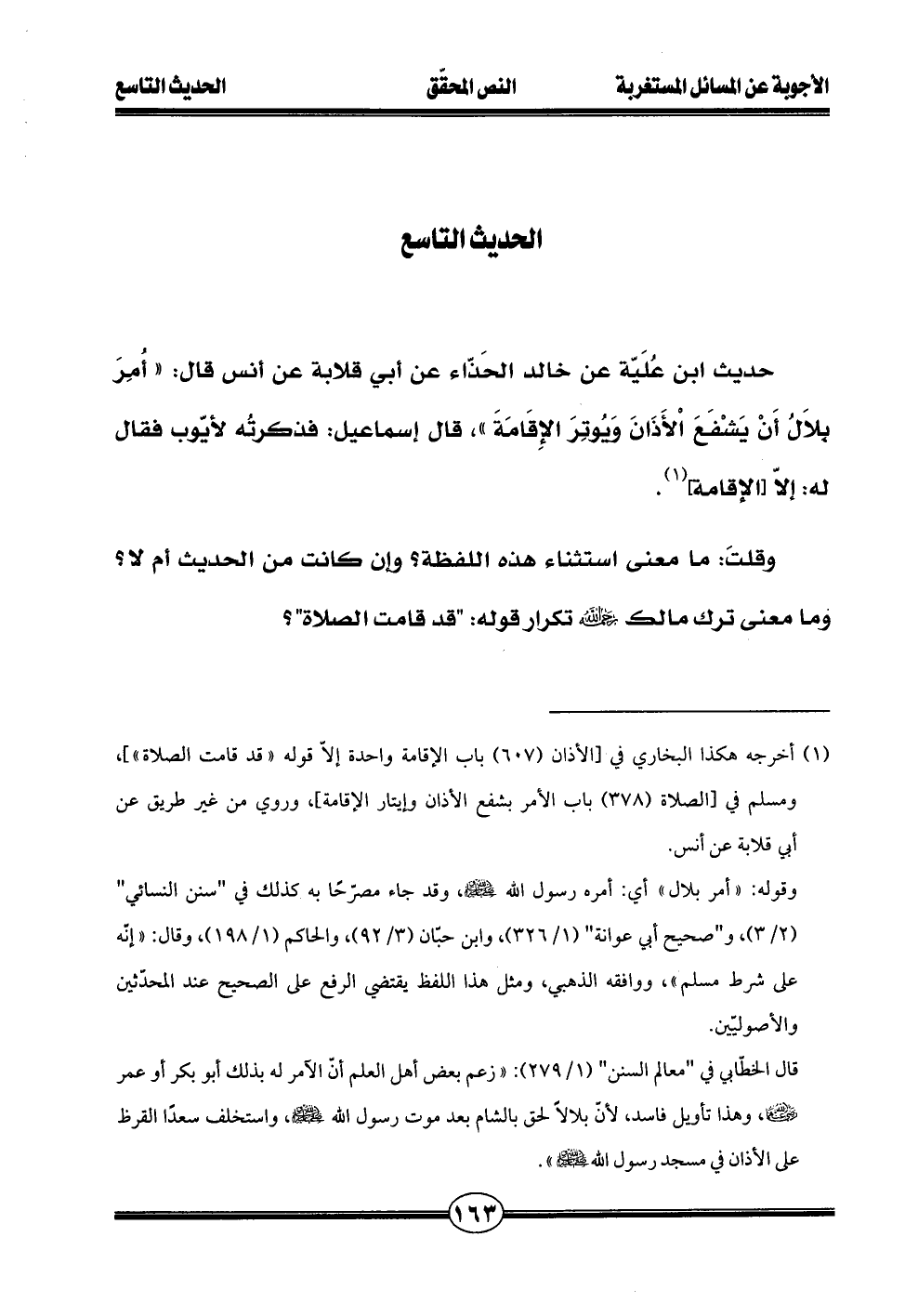 حديث ابن عُلَية عن خالد الحَذّاء عن أبي قلابة عن أنس قال: "أُمِرَ بلاَلُ أَنْ يَشْفَعَ اْلأَذَانَ وَيُوتِرَ الإِقَامَةَ"، قال إسماعيل: فذكرتُه لأيّوب فقال له: إلاّ [الإقامة] (¬1).