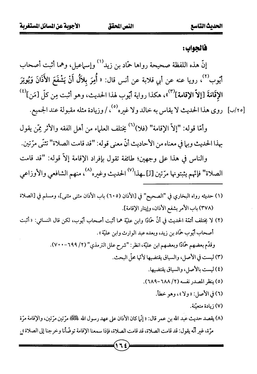 (¬8) يقصد حديث عبد الله بن عمر قال: "إنّما كان الأذان على عهد رسول الله - صلى الله عليه وسلم - مرّتين مرّتين، والإقامة مرّة مرّة، غير أنه يقول: قد قامت الصلاة، قد قامت الصلاة، فإذا سمعنا الإقامة توضّأنا وخرجنا إلى الصلاة".=