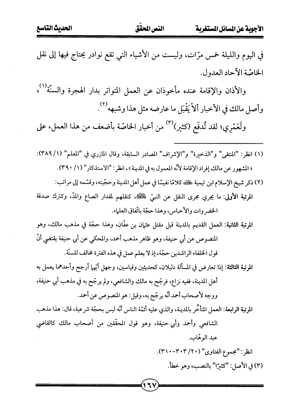 (¬2) ذكر شيخ الإسلام ابن تيمية - رضي الله عنه - كلامًا نفيسًا في عمل أهل المدينة وحجّيته، وقسّمه إلى مراتب: