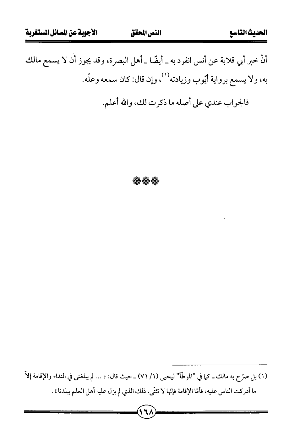 أنّ خبر أبي قلابة عن أنس انفرد به - أيضًا - أهل البصرة، وقد يجوز أن لا يسمع مالك به، ولا يسمع برواية أيّوب وزيادته (¬1)، وإن قال: كان سمعه وعلّه.