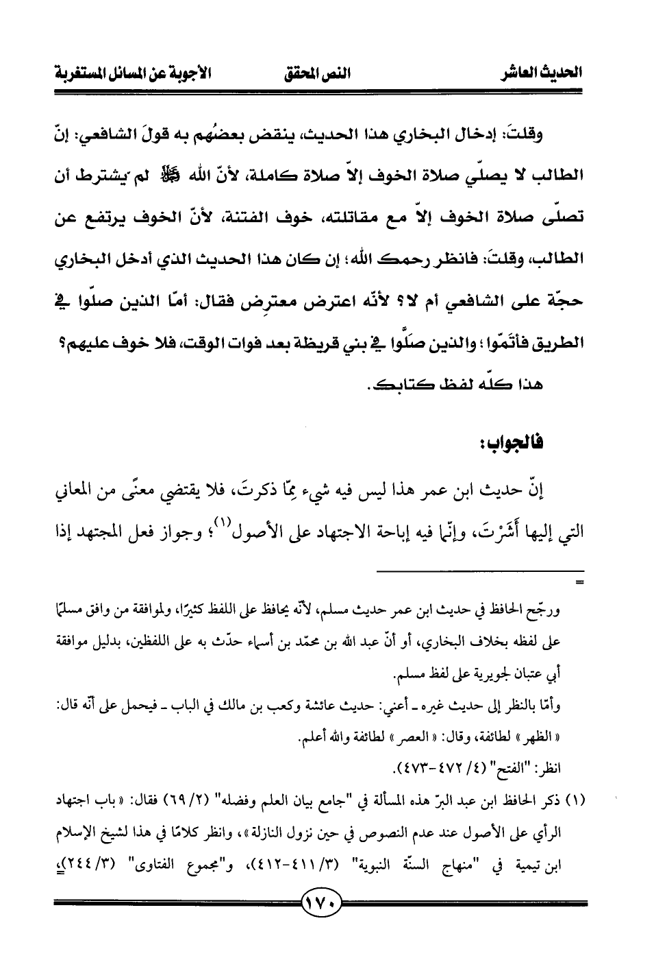 وقلتَ: إدخال البخاري هذا الحديث، ينقض بعضُهم به قولَ الشافعي: إنّ الطالب لا يصلّي صلاة الخوف إلّا صلاة كاملة؛ لأنّ الله - عَزَّ وَجَل - لم يشترط أن تصلّى صلاة الخوف إلاّ مع مقاتلته، خوف الفتنة؛ لأنّ الخوف يرتفع عن الطالب، وقلتَ: فانظر رحمك الله: إن كان هذا الحديث الذي أدخل البخاري حجّة على الشافعي أم لا؟ لأنّه اعترض معترِض فقال: أمّا الذين صلّوا في الطريق فأتَمّوا: والذين صَلّوا في بني قريظة بعد فوات الوقت، فلا خوف عليهم؟