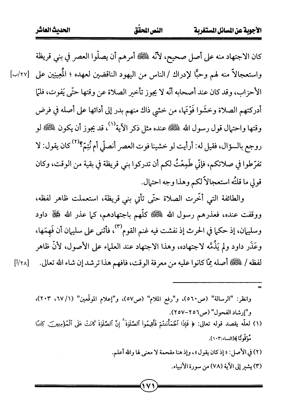والطائفة التي أخّرت الصلاة حتّى تأتي بني قريظة، استعملت ظاهر لفظه، ووقفت عنده، فعذرهم رسول الله - صلى الله عليه وسلم - كلّهم باجتهادهم، كما عذر الله - عزَّ وجَل - داود وسليمان، إذ حكما في الحرث إذ نفشت فيه غنم القوم (¬3)، فأثنى على سلمان أن فَهِمَها، وعَذَر داود ولم يَذُمَّه لاجتهاده، وهذا الاجتهاد عند العلماء على الأصول؛ لأنّ ظاهر لفظه - صلى الله عليه وسلم - أصله مِمّا كانوا عليه من معرفة الوقت، فافهم هذا ترشد إن شاء الله تعالى.