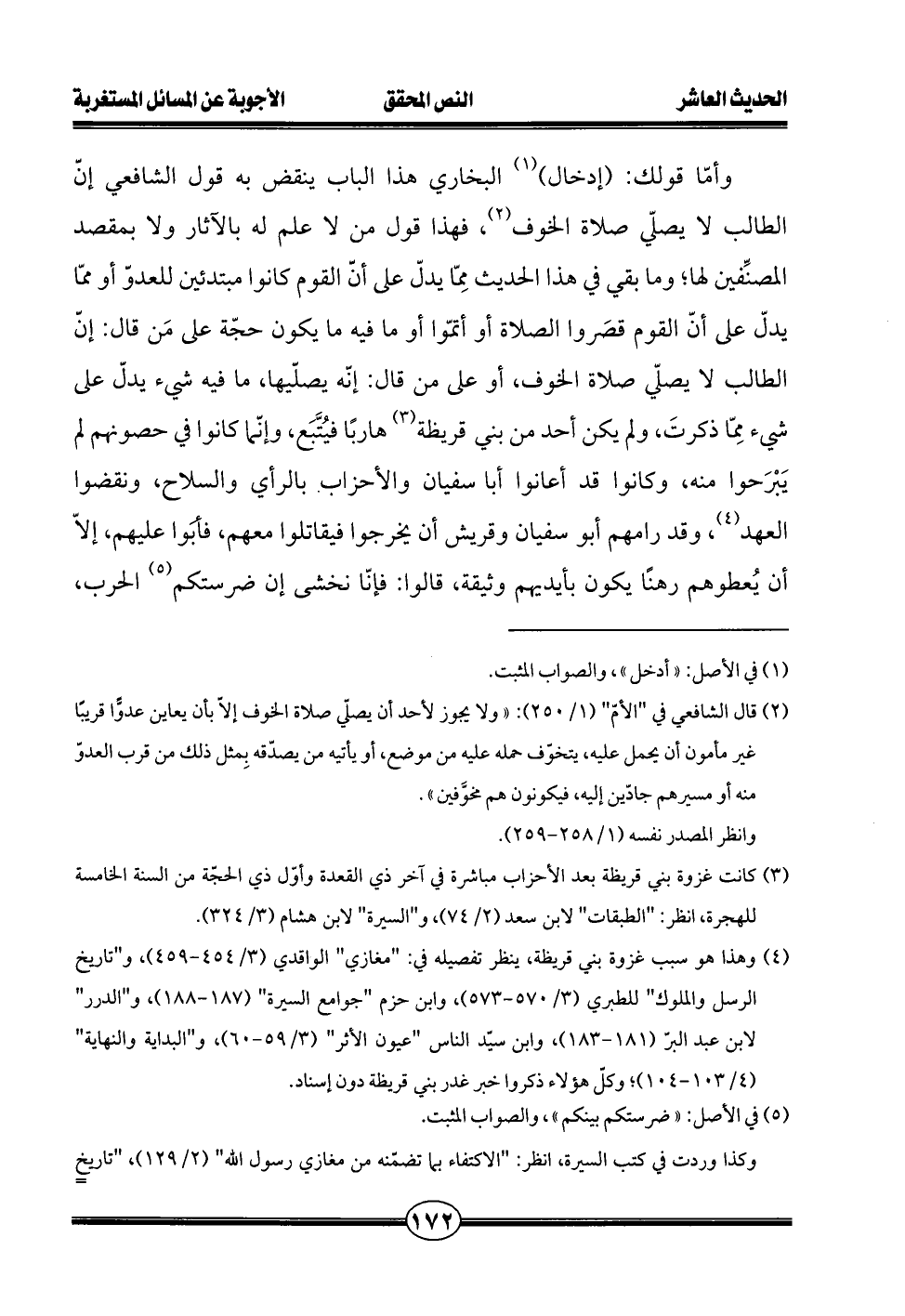 وأمّا قولك: (إدخال) (¬1) البخاري هذا الباب ينقض به قول الشافعي إنّ الطالب لا يصلّي صلاة الخوف (¬2)، فهذا قول من لا علم له بالآثار ولا بمقصد المصنِّفين لها؛ وما بقي في هذا الحديث مِمّا يدلّ على أنّ القوم كانوا مبتدئين للعدوّ أو ممّا يدلّ على أنّ القوم قصَروا الصلاة أو أتمّوا أو ما فيه ما يكون حجّة على مَن قال: إنّ الطالب لا يصلّي صلاة الخوف، أو على من قال: إنه يصلّيها، ما فيه شيء يدلّ على شيء مِمّا ذكرتَ، ولم يكن أحد من بني قريظة (¬3) هاربًا فيُتَّبَع، وإنّما كانوا في حصونهم لم يَبْرَحوا منه، وكانوا قد أعانوا أبا سفيان والأحزاب بالرأي والسلاح، ونقضوا العهد (¬4)، وقد رامهم أبو سفيان وقريش أن يخرجوا فيقاتلوا معهم، فأبَوا عليهم، إلاّ أن يُعطوهم رهنًا يكون بأيديهم وثيقة، قالوا: فإنّا نخشى إن ضرستكم (¬5) الحرب،