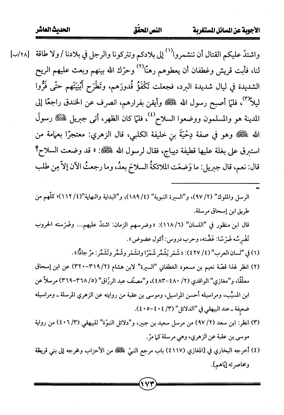 (¬2) انظر لهذا قصّة نعيم بن مسعود الغطفاني "السيرة" لابن هشام (2/ 319 - 320) عن ابن إسحاق معلّقًا، و"مغازي" الواقدي (2/ 480 - 483)، و"مصنف عبد الرزاق" (5/ 368 - 369) مرسلاً عن ابن المسيِّب، ومراسيله أحسن المراسيل، وموسى بن عقبة من روايته عن الزهري المرسلة - ومراسيله ضعيفة - عند البيهقي في "الدلائل" (3/ 404 - 405).