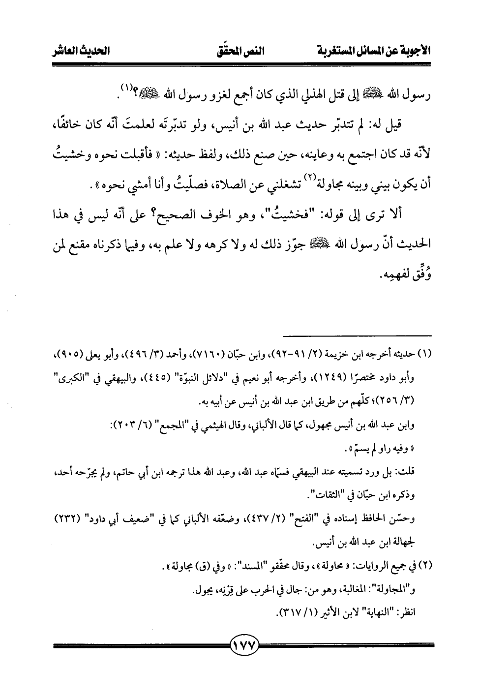 قيل له: لم تتدبّر حديث عبد الله بن أنيس، ولو تدبّرتَه لعلمتَ أنّه كان خائفًا، لأنّه قد كان اجتمع به وعاينه، حين صنع ذلك، ولفظ حديثه: " فأقبلت نحوه وخشيتُ أن يكون بيني وبينه مجاولة (¬2) تشغلني عن الصلاة، فصلّيتُ وأنا أمشي نحوه".