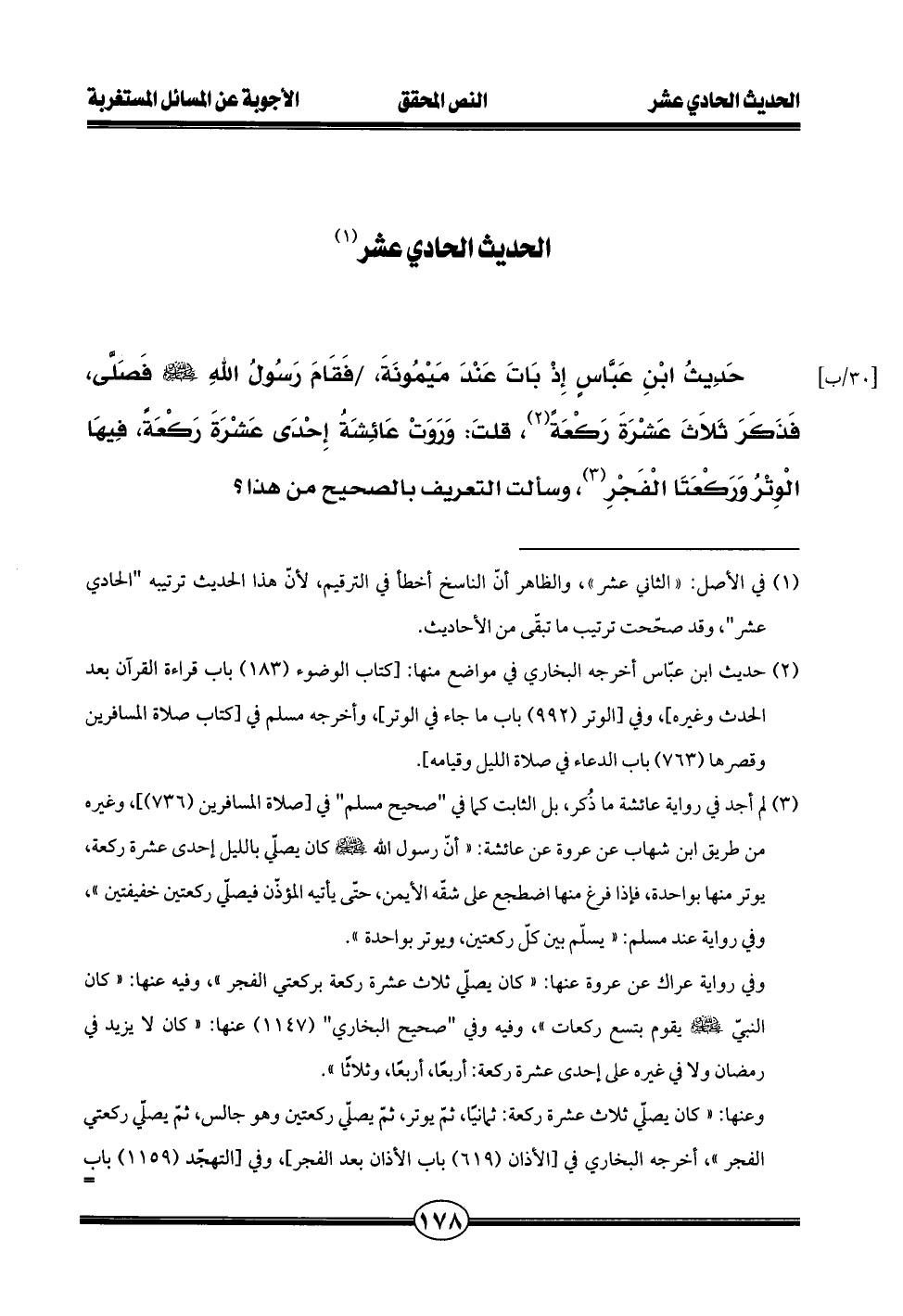 حَدِيثُ ابْنِ عبَّاسٍ إِذْ بَاتَ عَنْدَ مَيْمُونَةَ، فَقَامَ رَسُولُ اللهِ - صلى الله عليه وسلم - فَصَلّى، فَذَكَرَ ثَلاَثَ عَشْرَةَ رَكْعَةً (¬2)، قلتَ: وَرَوَتْ عَائِشَةُ إِحْدَى عَشْرَةَ رَكْعَةً، فِيهَا الْوِتْرُ وَرَكعَتَا الْفَجْرِ (¬3)، وسألت التعريف بالصحيح من هذا؟