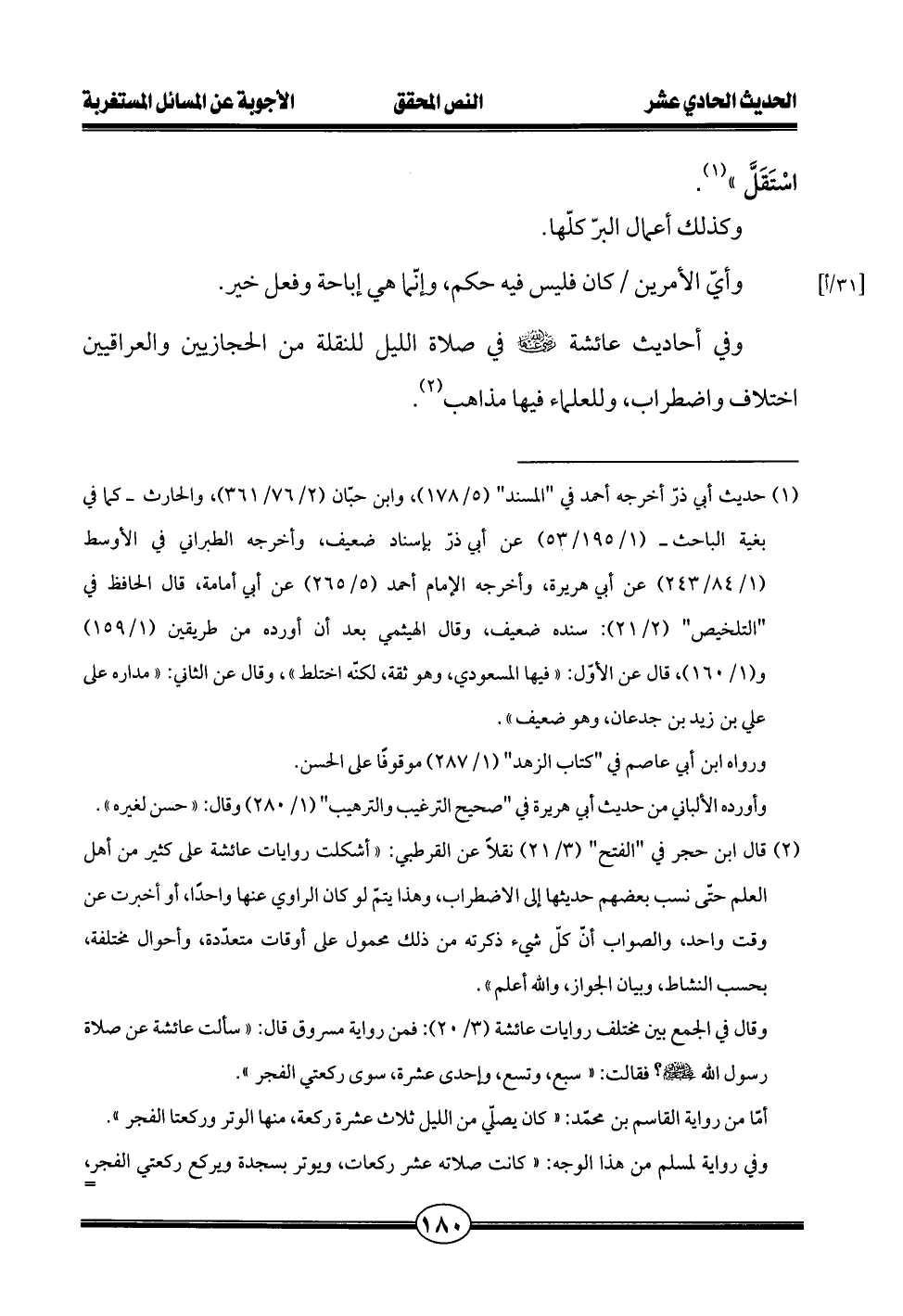 وفى أحاديث عائشة - رضي الله عنها - في صلاة الليل للنقلة من الحجازيين والعراقيين اختلاف واضطراب، وللعلماء فيها مذاهب (¬2).