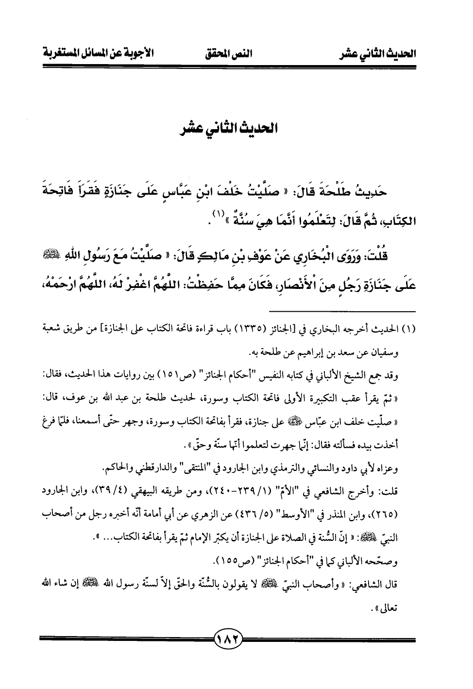 وقد جمع الشيخ الألباني في كتابه النفيس "أحكام الجنائز" (ص 151) بين روايات هذا الحديث، فقال: "ثمّ يقرأ عقب التكبيرة الأولى فاتحة الكتاب وسورة، لحديث طلحة بن عبد الله بن عوف، قال: "صلّيت خلف ابن عبّاس - صلى الله عليه وسلم - على جنازة، فقرأ بفاتحة الكتاب وسورة، وجهر حتّى أسمعنا، فلمّا فرغ أخذت بيده فسألته فقال: إنّما جهرت لتعلموا أنها سنّة وحقّ".