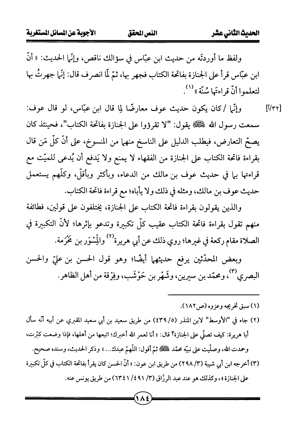 ولفظ ما أوردتَه من حديث ابن عبّاس في سؤالك ناقص، وإنّما الحديث: "أنّ ابن عبّاس قرأ على الجنازة بفاتحة الكتاب فجهر بها، ثمّ لمّا انصرف قال: إنّما جهرتُ بها لتعلموا أنّ قراءتَها سُنّة" (¬1).