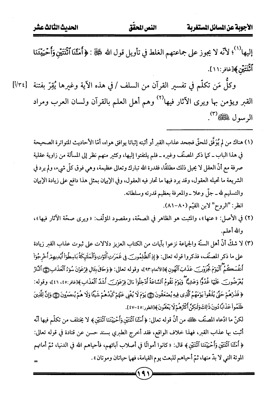 (¬1) هناك من لم يُوَفَّق للحقّ فجحد عذاب القبر أو أثبته إثباتا يوافق هواه، أمّا الأحاديث المتواترة الصحيحة في هذا الباب - كما ذكر المصنّف وغيره - فلم يلتفتوا إليها، وكثير منهم انظر إلى المسألة من زاوية عقلية صرفة مع أنّ العقل لا يحيل ذلك مطلقًا، فقدرة الله تبارك وتعالى عظيمة، وهي فوق كلّ شيء، ولم يرد في الشريعة ما تحيله العقول، وقد يرد فيها ما تحار فيه العقول، وفي الإيمان بمثل هذا دافع على زيادة الإيمان والتسليم لله - جل وعلا - والمعرفة بعظيم قدرته وسلطانه.