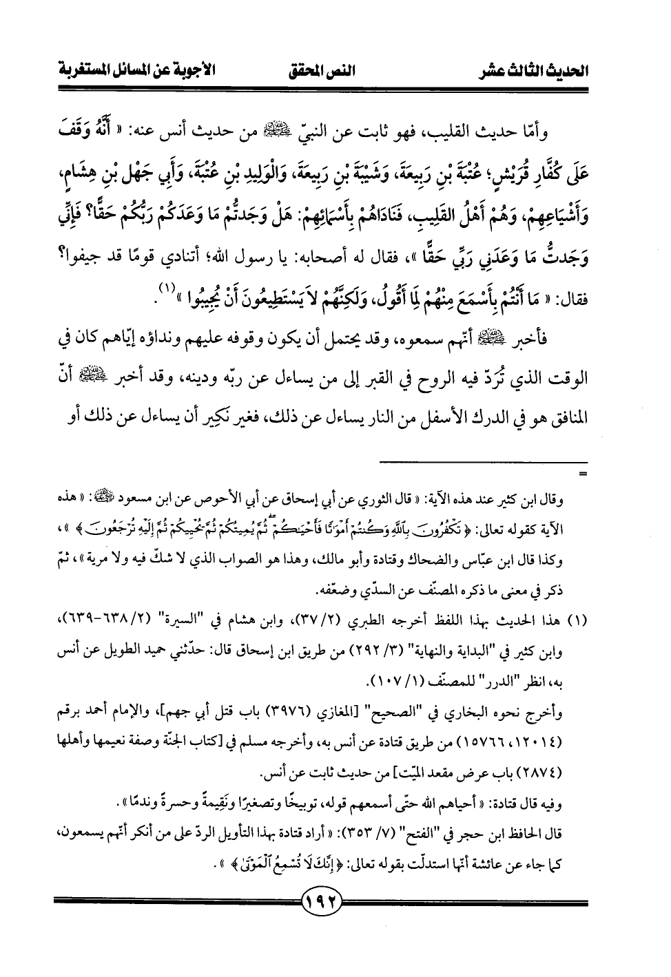 وأمّا حديث القليب، فهو ثابت عن النبيّ - صلى الله عليه وسلم - من حديث أنس عنه: "أنْهُ وَقَفَ عَلَى كفَّارِ قُرَيْشِ؛ عُتْبةَ بْنِ رَبِيعَةَ، وَشَيْبةَ بْنِ رَبِيعَةَ، وَالْوَليدِ بْنِ عُتْبةَ، وَأَبِي جَهْل بْنِ هِشَامٍ، وَأَشْيَاعِهِمْ، وَهُمْ أَهْلُ القَلِيبِ، فَنَادَاهُمْ بِأَسمائِهِمْ: هَلْ وَجَدتُّمْ مَا وَعَدَكُمْ رَبكُمْ حَقًّا؟ فَإِنِّي وَجَدتُّ مَا وَعَدَنِي رَبِّي حَقًا"، فقال له أصحابه: يا رسول الله؛ أتنادي قومًا قد جيفوا؟ فقال: "مَا أَنْتُمْ بِأَسْمَعَ مِنْهُمْ لمِا أَقُولُ، وَلَكِنّهمْ لاَ يَسْتَطِيعُونَ أَنْ يُجِيبُوا" (¬1).