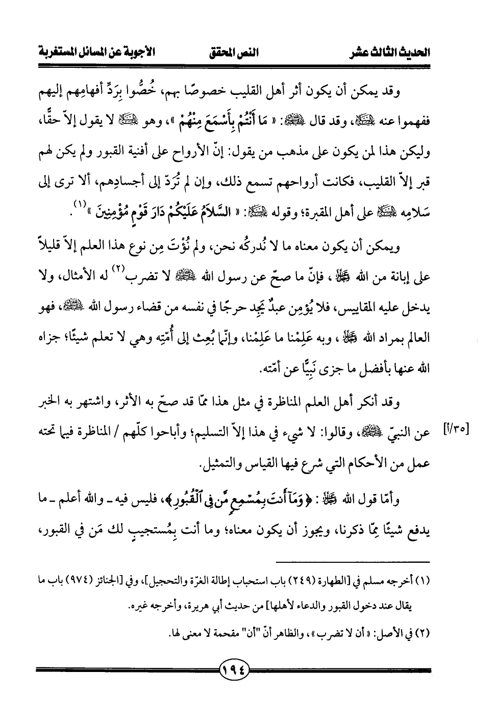 وقد يمكن أن يكون أثر أهل القليب خصوصًا بهم، خُصُّوا بِرَدِّ أفهامِهم إليهم ففهموا عنه عليه السلام، وقد قال - صلى الله عليه وسلم -: "مَا أَنْتُمْ بِأَسْمَعَ مِنْهُمْ"، وهو عليه السلام لا يقول إلّا حقًّا، وليكن هذا لمن يكون على مذهب من يقول: إنّ الأرواح على أفنية القبور ولم يكن لهم قبر إلّا القليب، فكانت أرواحهم تسمع ذلك، وإن لم تردّ إلى أجسادهم، ألا ترى إلى سَلامِه - صلى الله عليه وسلم - على أهل المقبرة؛ وقوله - صلى الله عليه وسلم -: "السَّلاَمُ عَلَيكُمْ دَارَ قَوْمٍ مُؤْمنينَ" (¬1).