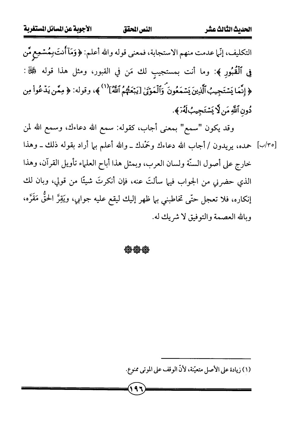 وقد يكون "سمع" بمعنى أجاب، كقوله: سمع الله دعاءك، وسمع الله لمن حمده، يريدون أجاب الله دعاءك وحَمْدك - والله أعلم بما أراد بقوله ذلك - وهذا خارج على أصول السنّة ولسان العرب، وبمثل هذا أباح العلماء تأويل القرآن، وهذا الذي حضرني من الجواب فيما سألتَ عنه، فإن أنكرتَ شيئًا من قولي، وبان لك إنكاره، فلا تعجل حتّى تخاطبني بما ظهر إليك ليقع عليه جوابي، ويَقِرَّ الحقُّ مَقَرَّه، وبالله العصمة والتوفيق لا شريك له.