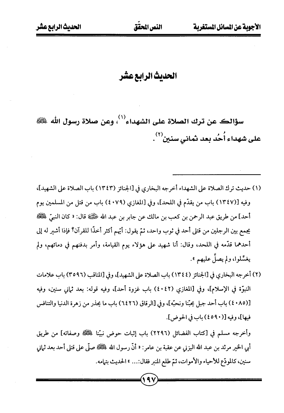 (¬1) حديث ترك الصلاة على الشهداء أخرجه البخاري في [الجنائز (1343) باب الصلاة على الشهيد]، وفيه [(1347) باب من يقدّم في اللحد]، وفي [المغازي (4079) باب من قتل من المسلمين يوم أحد] من طريق عبد الرحمن بن كعب بن مالك عن جابر بن عبد الله - رضي الله عنهما - قال: "كان النبيّ - صلى الله عليه وسلم - يجمع بين الرجلين من قتلى أحد في ثوب واحد، ثم يقول: أيّهم أكثر أخذًا للقرآن؟ فإذا أشير له إلى أحدهما قدّمه في اللحد، وقال: أنا شهيد على هؤلاء يوم القيامة، وأمر بدفنهم في دمائهم، ولم يغسَّلوا، ولم يصلَّ عليهم".