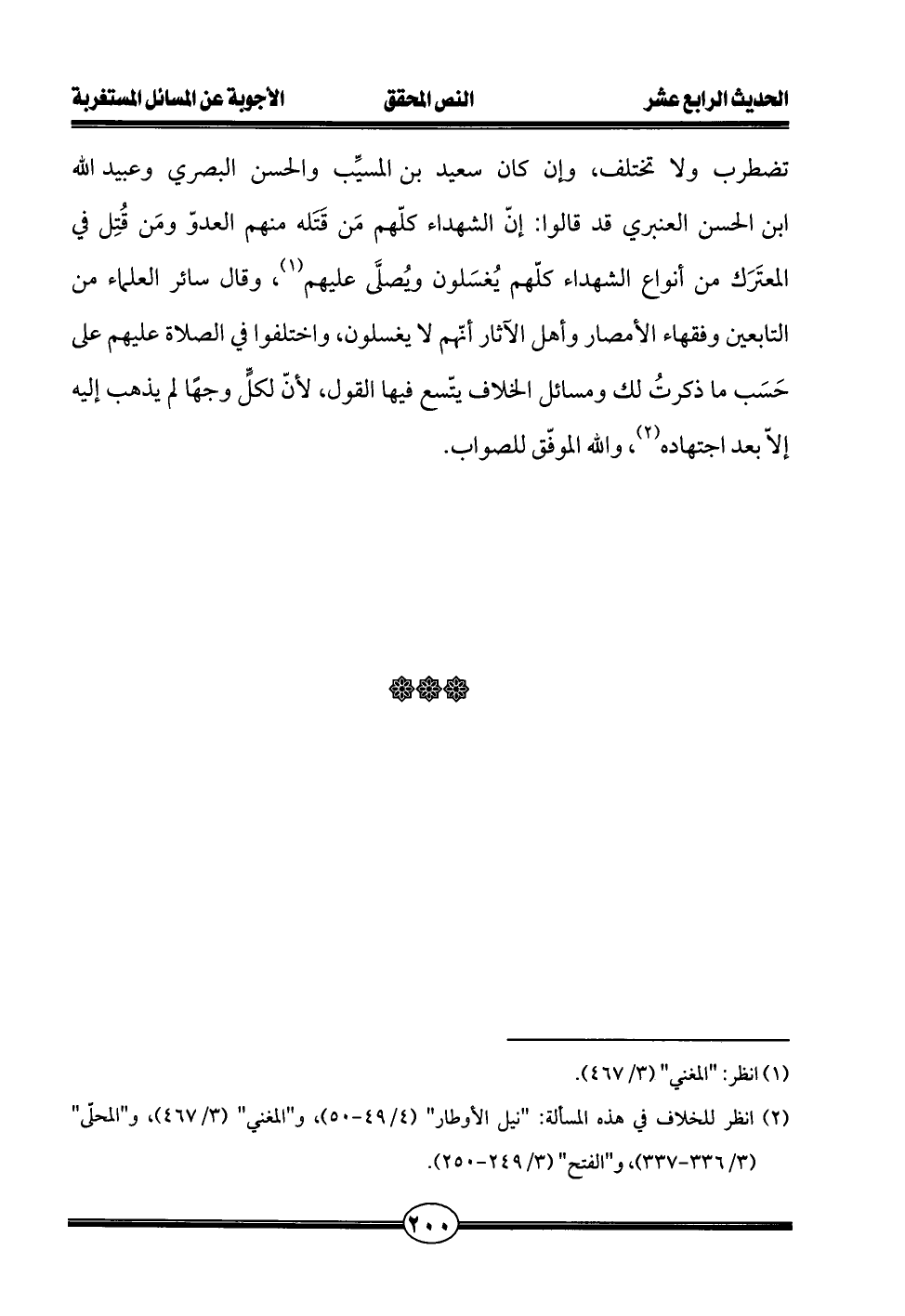 تضطرب ولا تختلف، وإن كان سعيد بن المسيِّب والحسن البصري وعبيد الله ابن الحسن العنبري قد قالوا: إنّ الشهداء كلّهم مَن قَتَله منهم العدوّ ومَن قُتِل في المعتَرَك من أنواع الشهداء كلّهم يُغسَلون ويُصلَّى عليهم (¬1)، وقال سائر العلماء من التابعين وفقهاء الأمصار وأهل الآثار أنّهم لا يغسلون، واختلفوا في الصلاة عليهم على حَسَب ما ذكرتُ لك ومسائل الخلاف يتّسع فيها القول؛ لأنّ لكلٍّ وجهًا لم يذهب إليه إلّا بعد اجتهاده (¬2)، والله الموفّق للصواب.