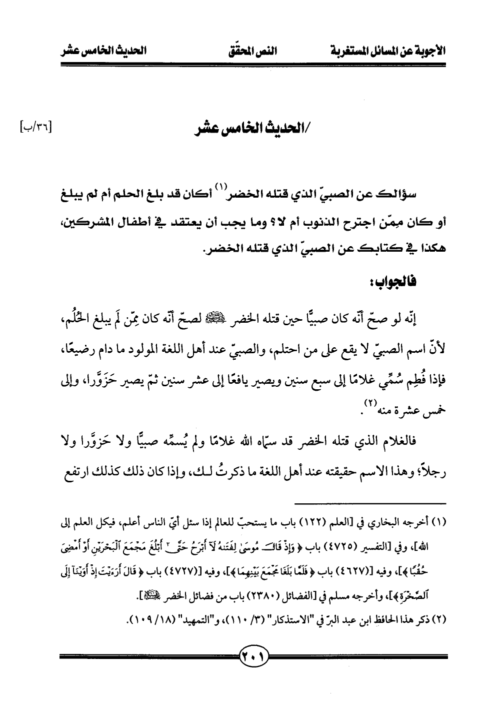 سؤالك عن الصبيّ الذي قتله الخضر (¬1) أكان قد بلغ الحلم أم لم يبلغ أو كان مِمّن اجترح الذنوب أم لا؟ وما يجب أن يعتقد في أطفال المشركين، هكذا في كتابك عن الصبيّ الدي قتله الخضر.
