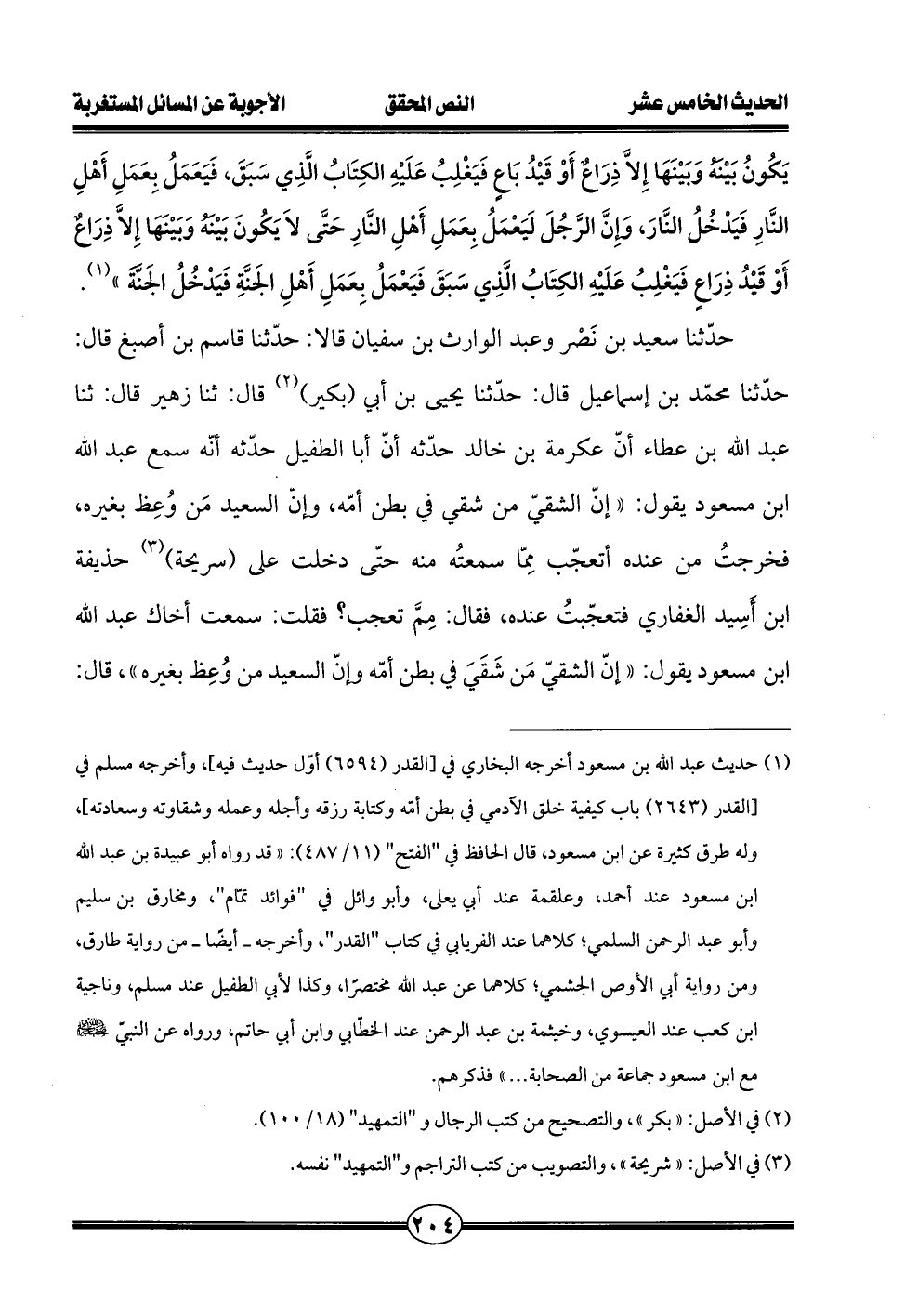 حدّثنا سعيد بن نَصْر وعبد الوارث بن سفيان قالا: حدّثنا قاسم بن أصبغ قال: حدّثنا محمّد بن إسماعيل قال: حدّثنا يحيى بن أبي (بكير) (¬2) قال: ثنا زهير قال: ثنا عبد الله بن عطاء أنّ عكرمة بن خالد حدّثه أنّ أبا الطفيل حدّثه أنّه سمع عبد الله ابن مسعود يقول: "إنّ الشقيّ من شقي في بطن أمّه، وإنّ السعيد مَن وُعِظ بغيره، فخرجتُ من عنده أتعجّب مِمّا سمعتُه منه حتّى دخلت على (سريحة) (¬3) حذيفة ابن أَسِيد الغفاري فتعجّبتُ عنده، فقال: مِمَّ تعجب؟ فقلت: سمعت أخاك عبد الله ابن مسعود يقول: "إنّ الشقيّ مَن شَقَيَ في بطن أمّه وإنّ السعيد من وُعِظ بغيره"، قال: