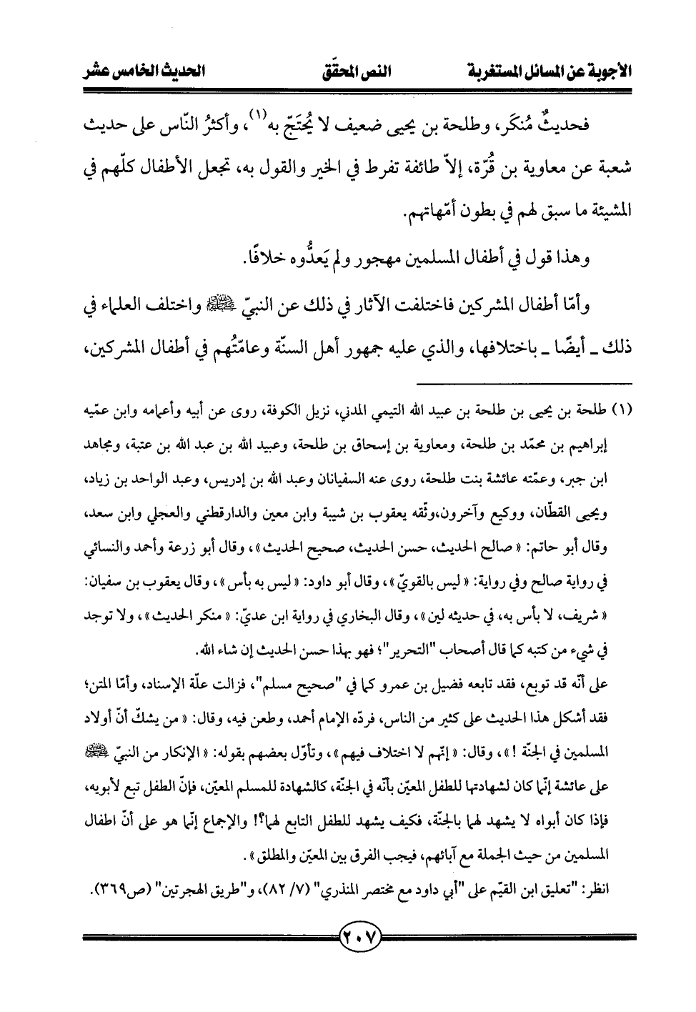 على أنّه قد توبع، فقد تابعه فضيل بن عمرو كما في "صحيح مسلم"، فزالت علّة الإسناد، وأمّا المتن؛ فقد أشكل هذا الحديث على كثير من الناس، فردّه الإمام أحمد، وطعن فيه، وقال: "من يشكّ أنّ أولاد المسلمين في الجنّة! "، وقال: "إنهم لا اختلاف فيهم"، وتأوّل بعضهم بقوله: "الإنكار من النبي - صلى الله عليه وسلم - على عائشة إنما كان لشهادتها للطفل المعين بأنه في الجنة، كالشهادة للمسلم المعين، فإن الطفل تبع لأبويه، فإذا كان أبواه لا يشهد لهما بالجنّة، فكيف يشهد للطفل التابع لهما؟ ! والإجماع إنما هو على أنّ أطفال المسلمين من حيث الجملة مع آبائهم، فيجب الفرق بين المعيّن والمطلق".