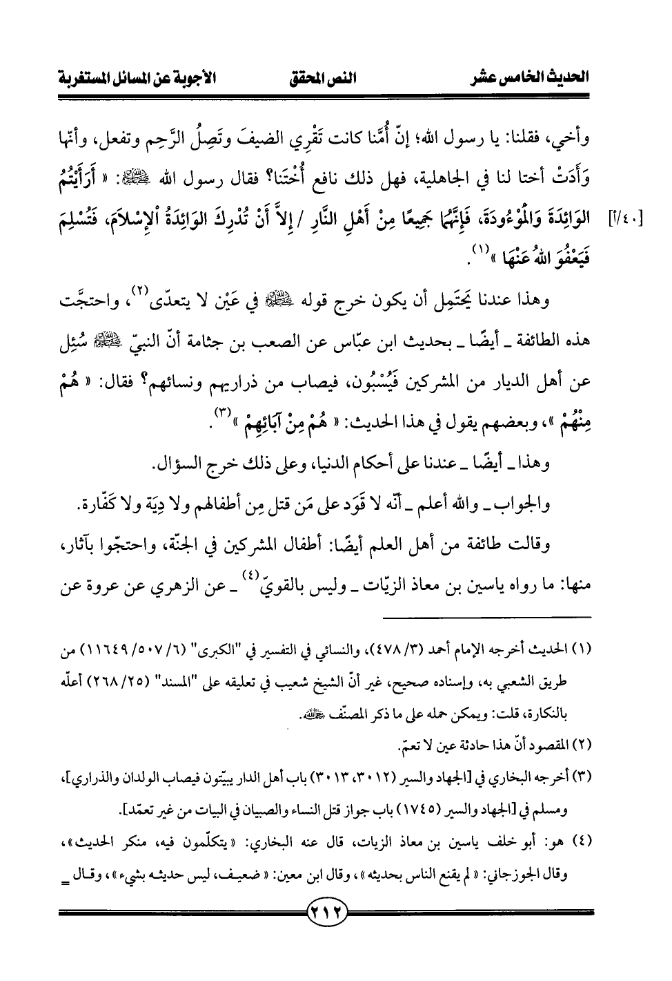 (¬3) أخرجه البخاري في [الجهاد والسير (3012، 3013) باب أهل الدار يبيّتون فيصاب الولدان والذراري]، ومسلم في [الجهاد والسير (1745) باب جواز قتل النساء والصبيان في البيات من غير تعمّد].