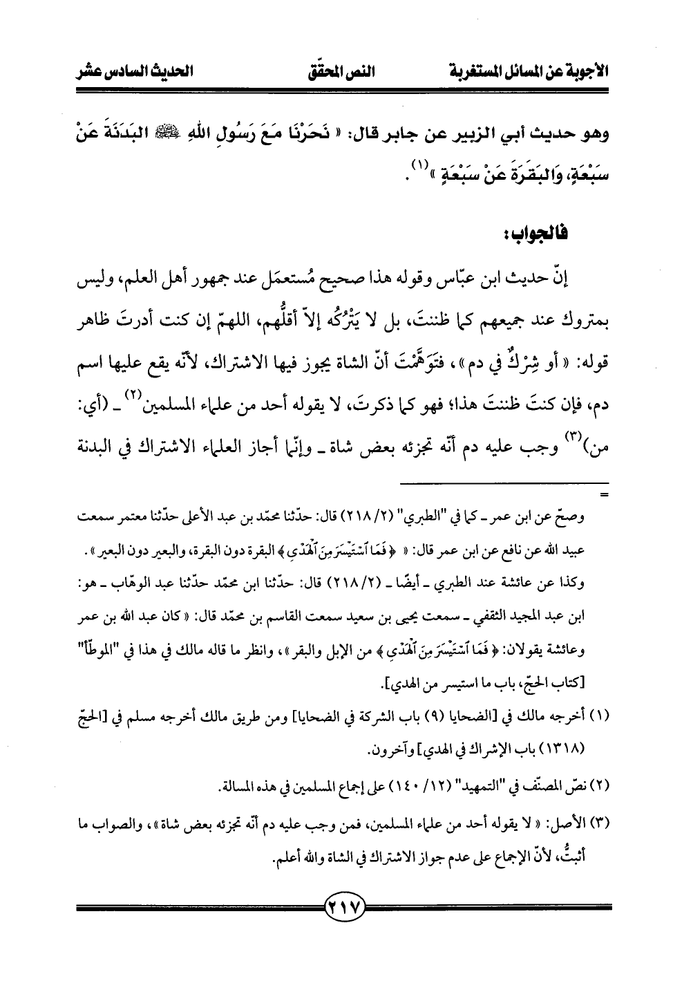 (¬1) أخرجه مالك في [الضحايا (9) باب الشركة في الضحايا] ومن طريق مالك أخرجه مسلم في [الحجّ (1318) باب الإشراك في الهدي] وآخرون.