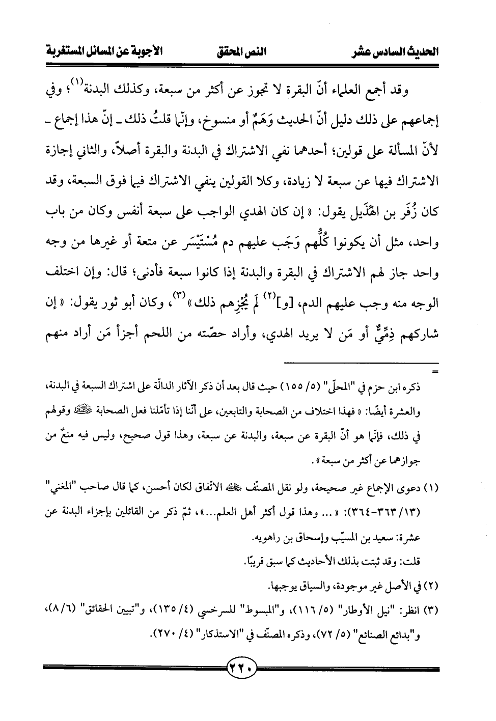 = ذكره ابن حزم في "المحلّى" (5/ 155) حيث قال بعد أن ذكر الآثار الدالّة على اشتراك السبعة في البدنة، والعشرة أيضًا: "فهذا اختلاف من الصحابة والتابعين، على أنّنا إذا تأمّلنا فعل الصحابة - رضي الله عنهم - وقولهم في ذلك، فإنّما هو أنّ البقرة عن سبعة، والبدنة عن سبعة، وهذا قول صحيح، وليس فيه منعٌ من جوازهما عن أكثر من سبعة".
