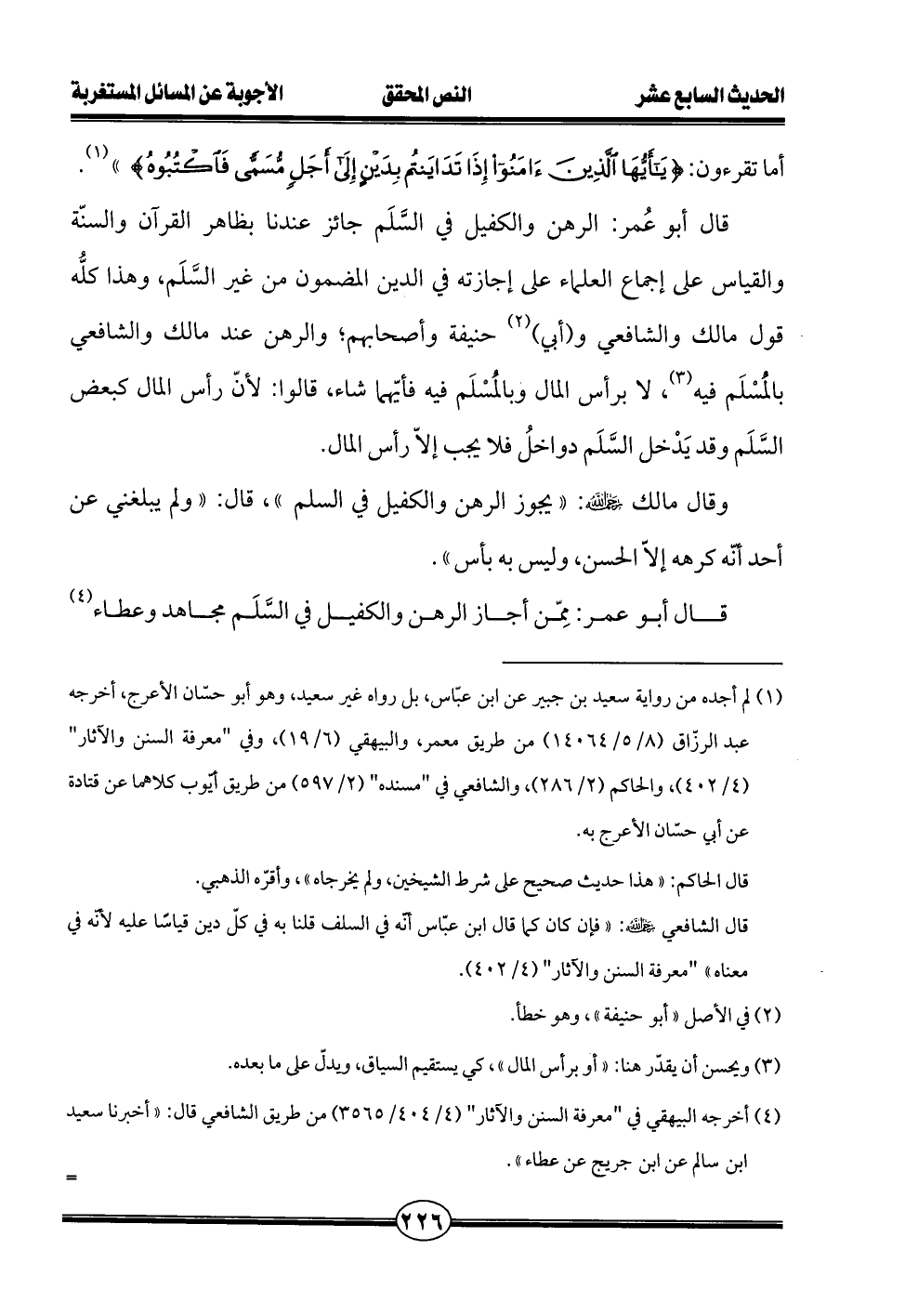 وقال مالك رحمه الله: "يجوز الرهن والكفيل في السلم"، قال: "ولم يبلغني عن أحد أنّه كرهه إلّا الحسن، وليس به بأس".