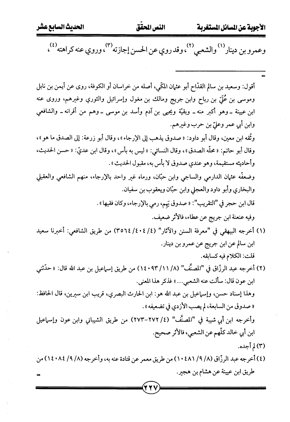 = أقول: وسعيد بن سالم القدّاح أبو عثمان المكّي، أصله من خراسان أو الكوفة، روى عن أيمن بن نابل وموسى بن عُلَيّ بن رباح وابن جريج ومالك بن مغول وإسرائيل والثوري وغيرهم، وروى عنه ابن عيينة - وهو أكبر منه - وبقيّة ويحيى بن آدم وأسد بن موسى - وهم من أقرانه - والشافعي وابن أبي عمر وعليّ بن حرب وغيرهم.