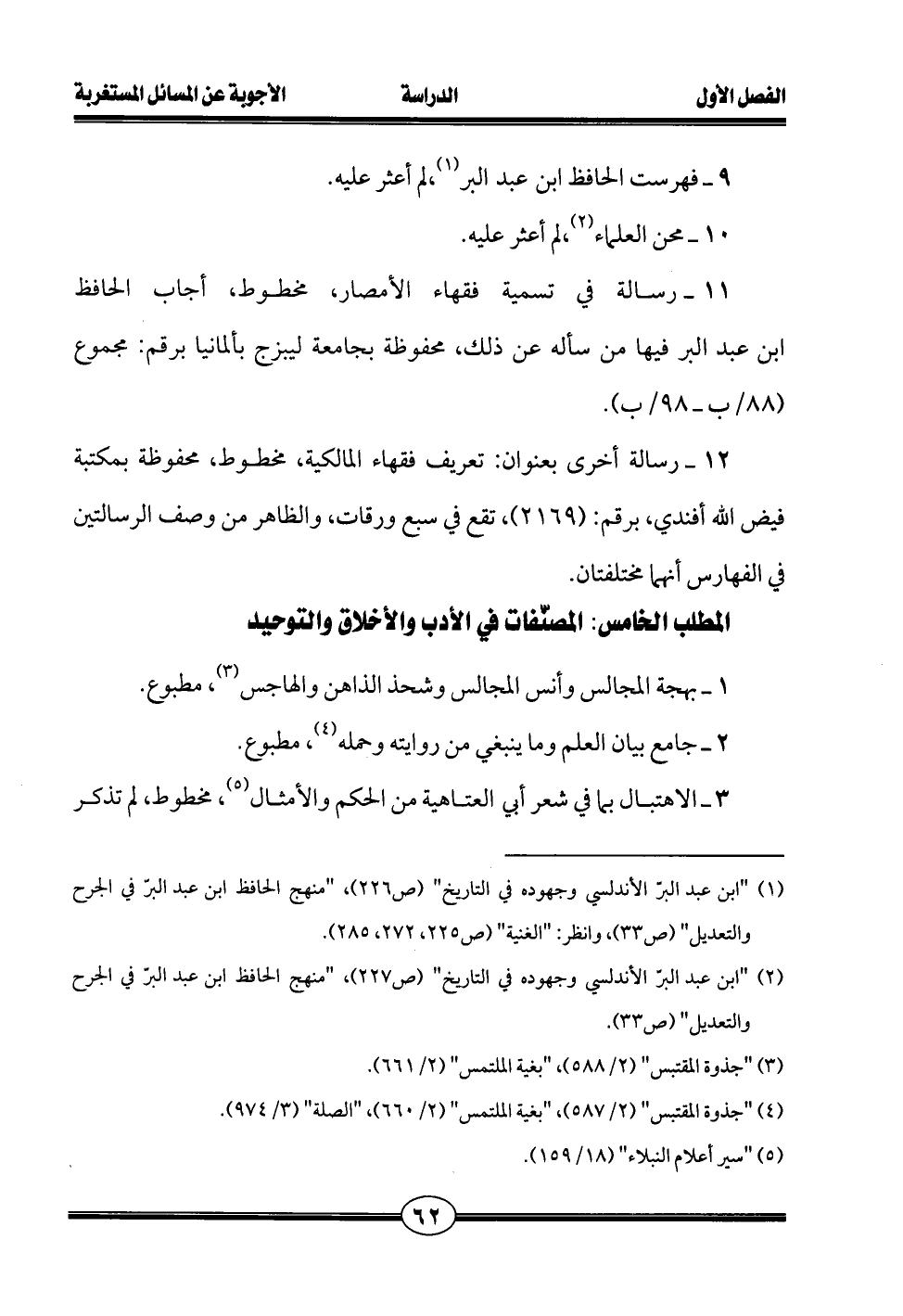 (¬2) "ابن عبد البرّ الأندلسي وجهوده في التاريخ" (ص 227)، "منهج الحافظ ابن عبد البرّ في الجرح والتعديل" (ص 33).