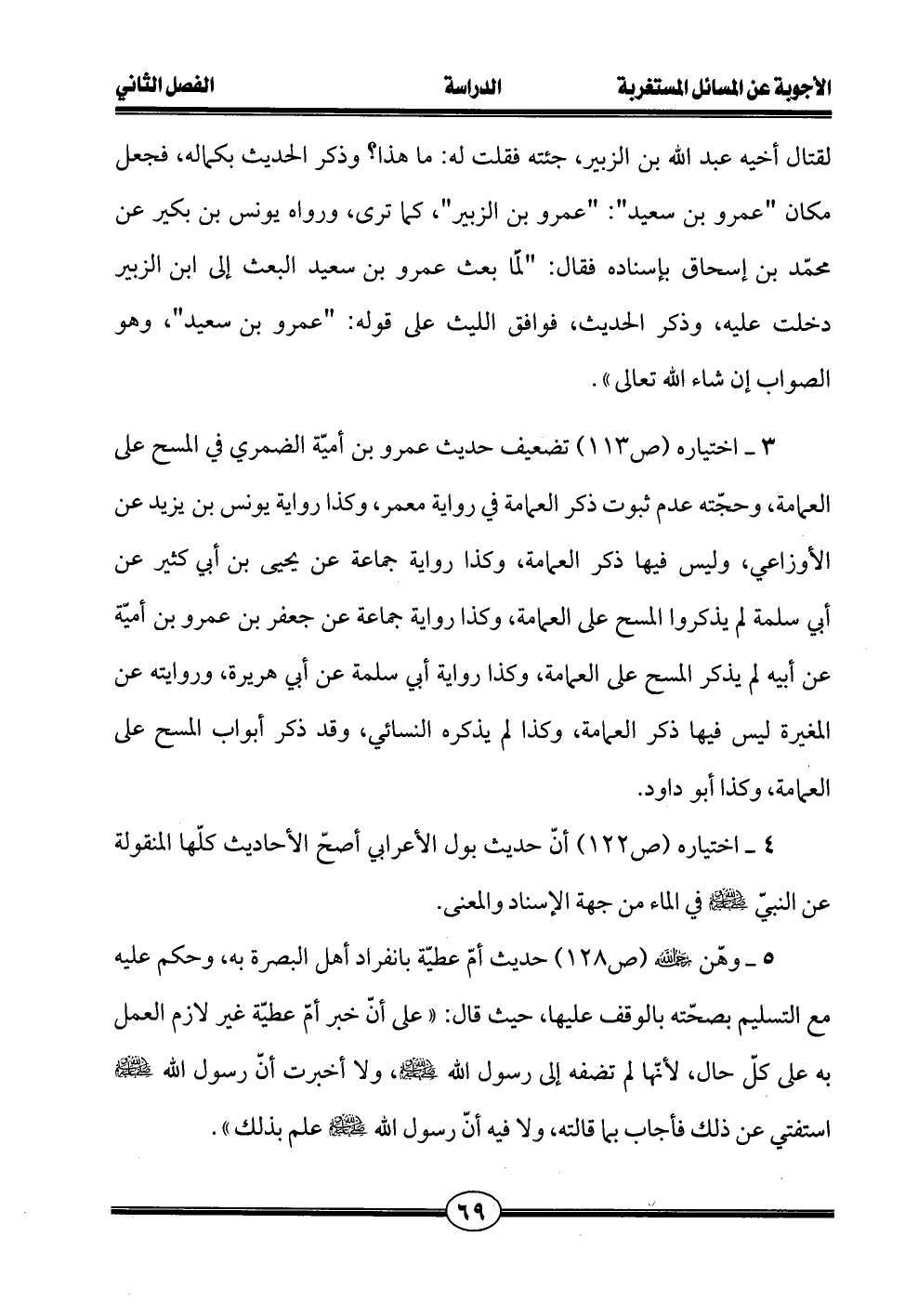 3 - اختياره (ص 113) تضعيف حديث عمرو بن أميّة الضمري في المسح على العمامة، وحجّته عدم ثبوت ذكر العمامة في رواية معمر، وكذا رواية يونس بن يزيد عن الأوزاعي، وليس فيها ذكر العمامة، وكذا رواية جماعة عن يحيى بن أبي كثير عن أبي سلمة لم يذكروا المسح على العمامة، وكذا رواية جماعة عن جعفر بن عمرو بن أميّة عن أبيه لم يذكر المسح على العمامة، وكذا رواية أبي سلمة عن أبي هريرة، وروايته عن المغيرة ليس فيها ذكر العمامة، وكذا لم يذكره النسائي، وقد ذكر أبواب المسح على العمامة، وكذا أبو داود.