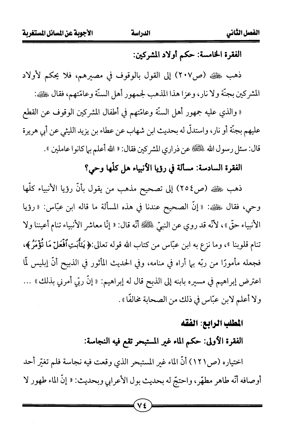 اختياره (ص 121) أنّ الماء غير المستبحر الذي وقعت فيه نجاسة فلم تغيّر أحد أوصافه أنّه طاهر مطهّر، واحتجّ له بحديث بول الأعرابي وبحديث: "إنّ الماء طهور لا