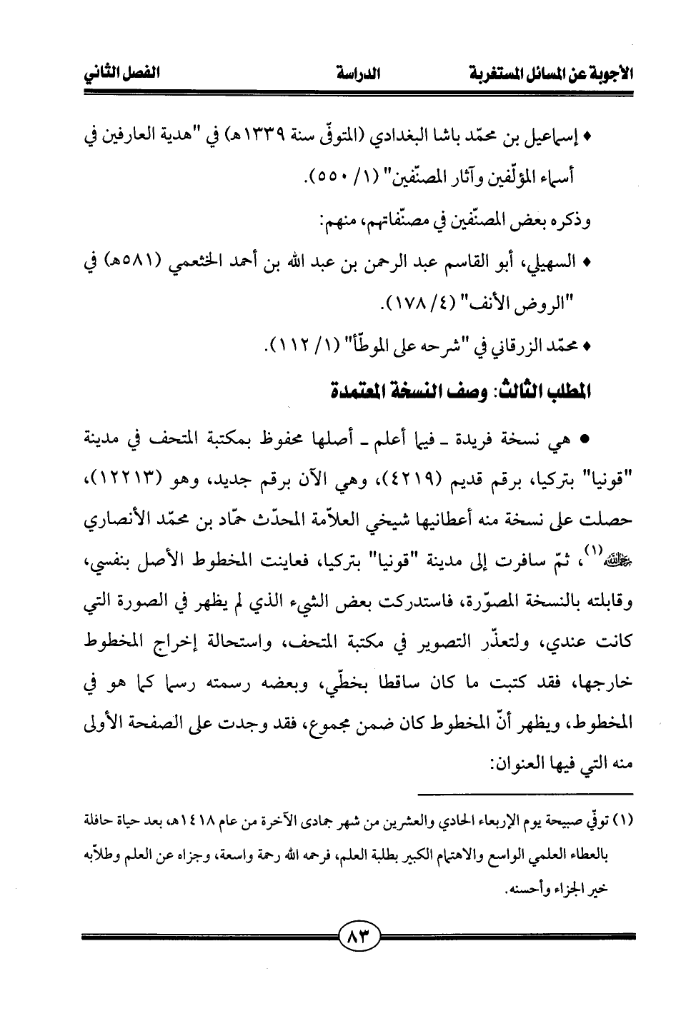 • هي نسخة فريدة - فيما أعلم - أصلها محفوظ بمكتبة المتحف في مدينة "قونيا" بتركيا، برقم قديم (4219)، وهي الآن برقم جديد، وهو (12213)، حصلت على نسخة منه أعطانيها شيخي العلاّمة المحدّث حمّاد بن محمّد الأنصاري رحمه الله (¬1)، ثمّ سافرت إلى مدينة "قونيا" بتركيا، فعاينت المخطوط الأصل بنفسي، وقابلته بالنسخة المصوّرة، فاستدركت بعض الشيء الذي لم يظهر في الصورة التي كانت عندي، ولتعذّر التصوير في مكتبة المتحف، واستحالة إخراج المخطوط خارجها، فقد كتبت ما كان ساقطا بخطّي، وبعضه رسمته رسما كما هو في المخطوط، ويظهر أنّ المخطوط كان ضمن مجموع، فقد وجدت على الصفحة الأولى منه التي فيها العنوان: